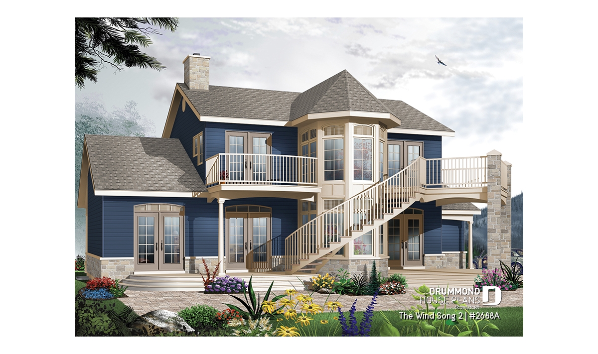Other notable features of this model: first, access to either a porch, a balcony or a terrace from each of the bedrooms. Exterior access also from the living room and from the breakfast area for which a covered terrace provides a lovely outdoor room. Next, a vast bonus space above the garage to which we gain access from the garage and from the upper level for even more convenience. Related model 2688, is reversed and of a different colour, in order to provide other options.