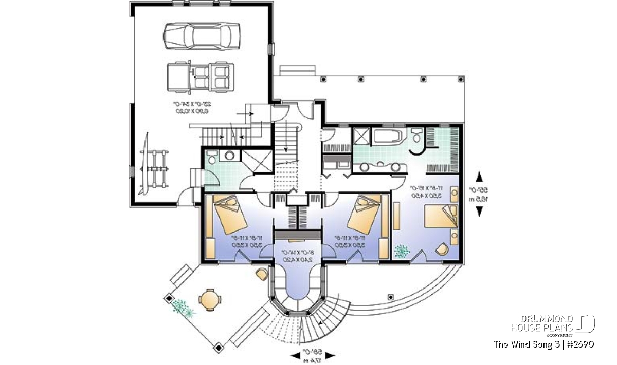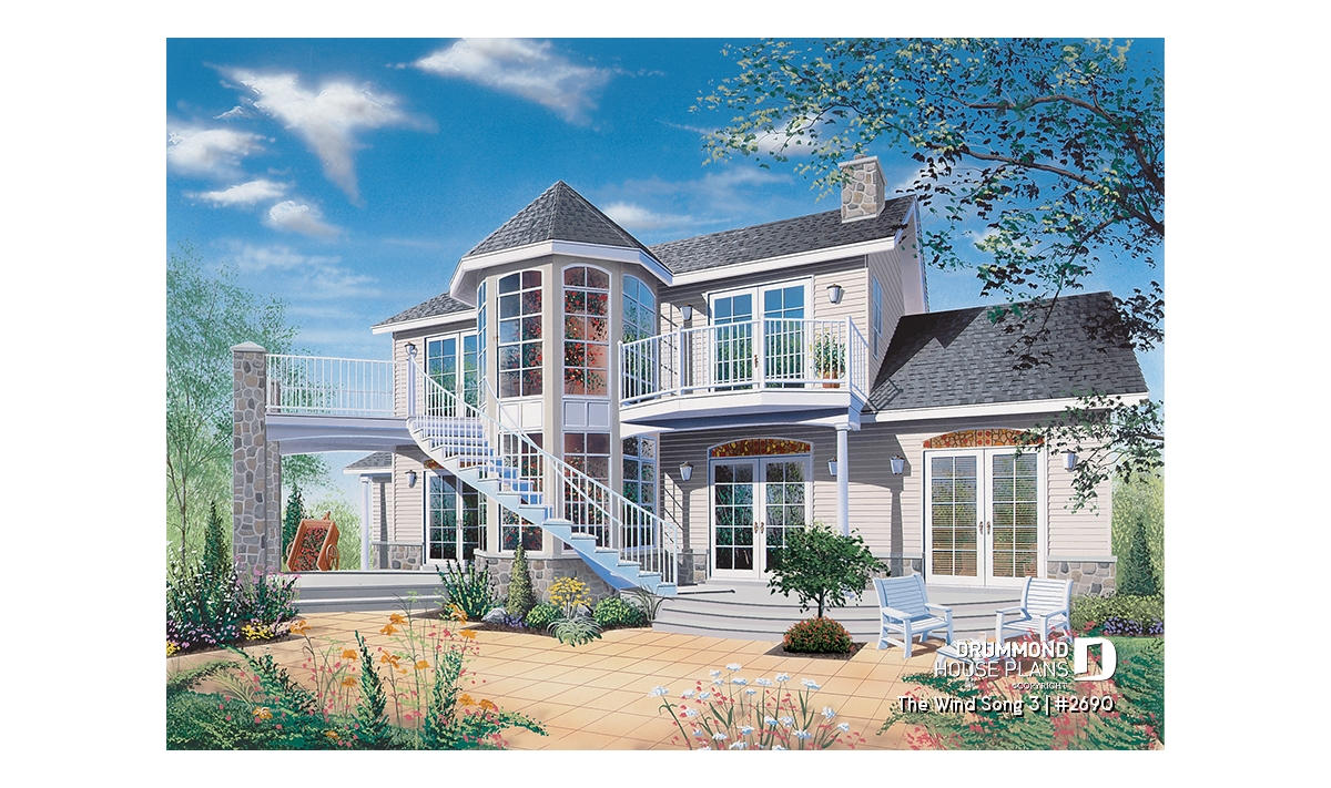 Bathing in natural light, this 2068 sq.ft. three bedrooms with 2.5 baths features a main-level master suite and bath, two secondary bedrooms, and bath. For a creative twist, the second-level hosts the living room, fireplace, dining room, lovely solarium for extra seating, counter kitchen, breakfast area, and half-bath. A cuvacious exterior stairway sets off the look, dramatically.