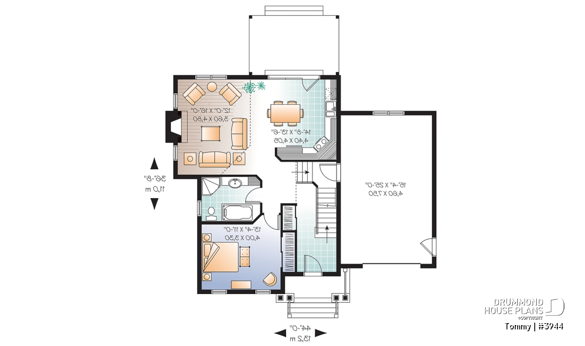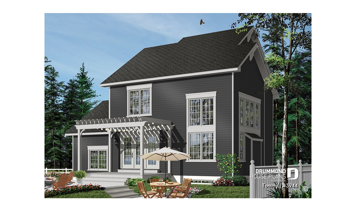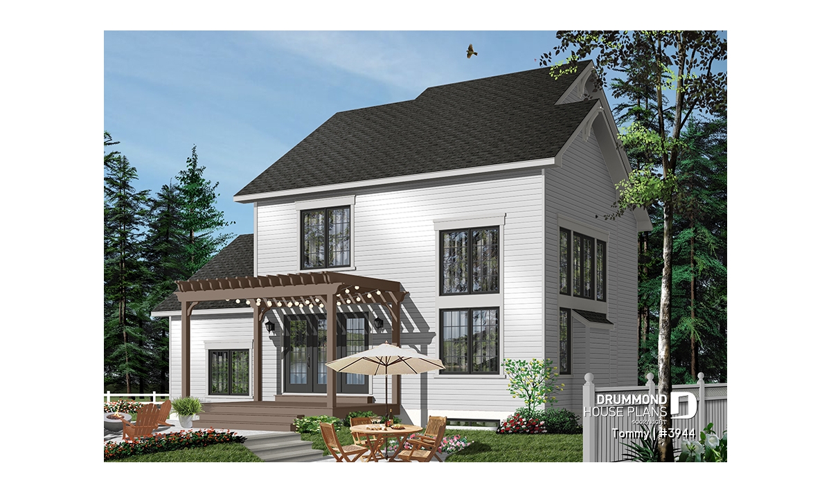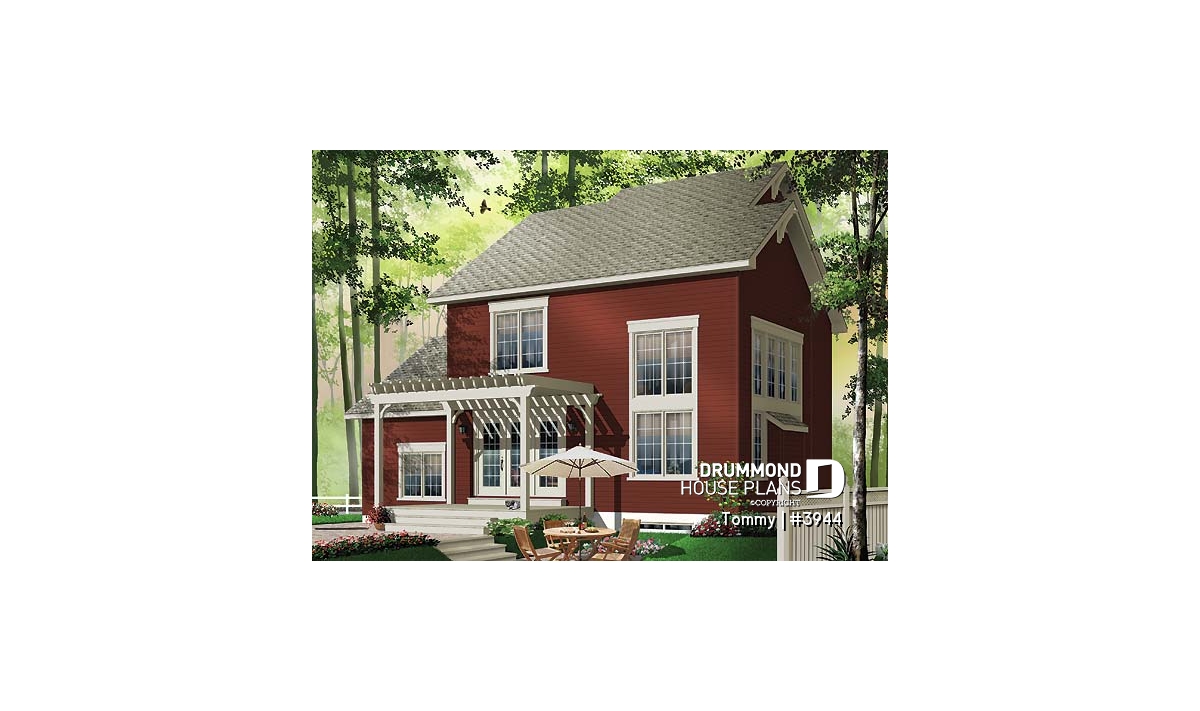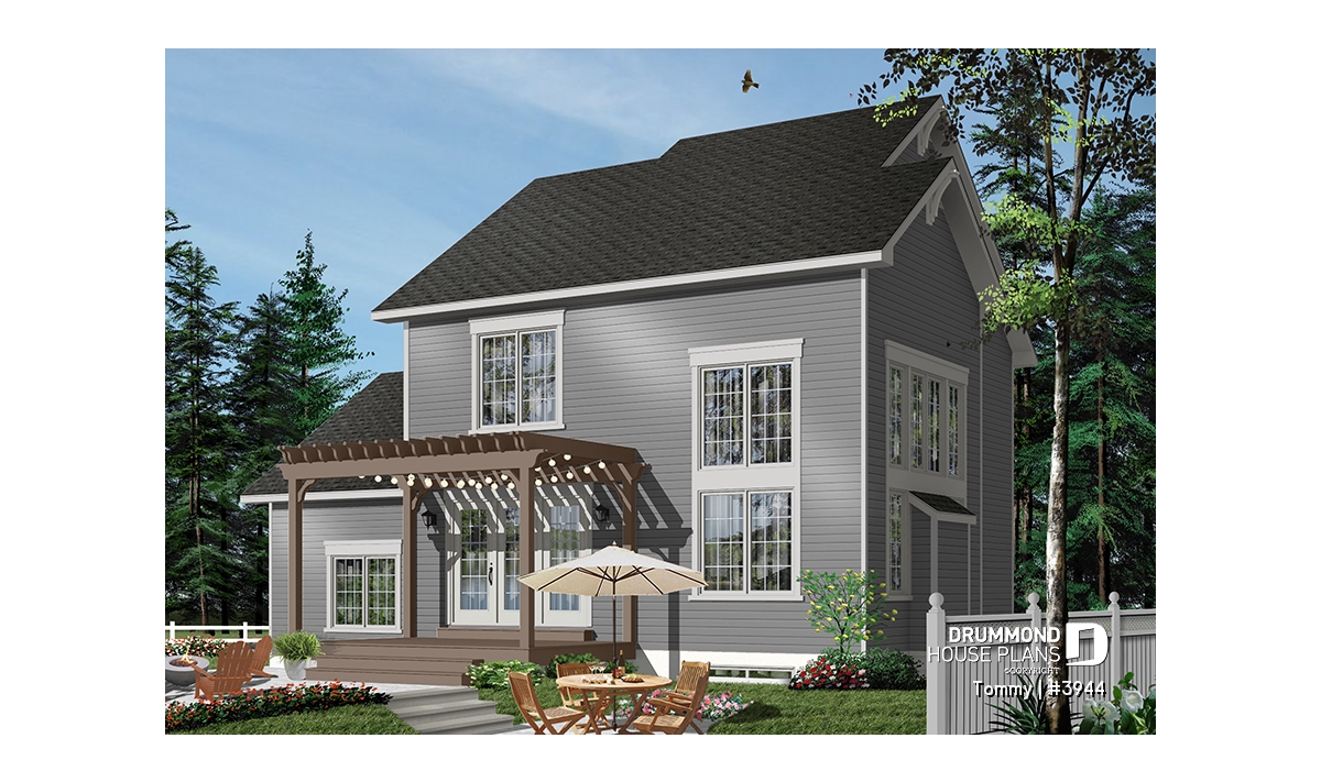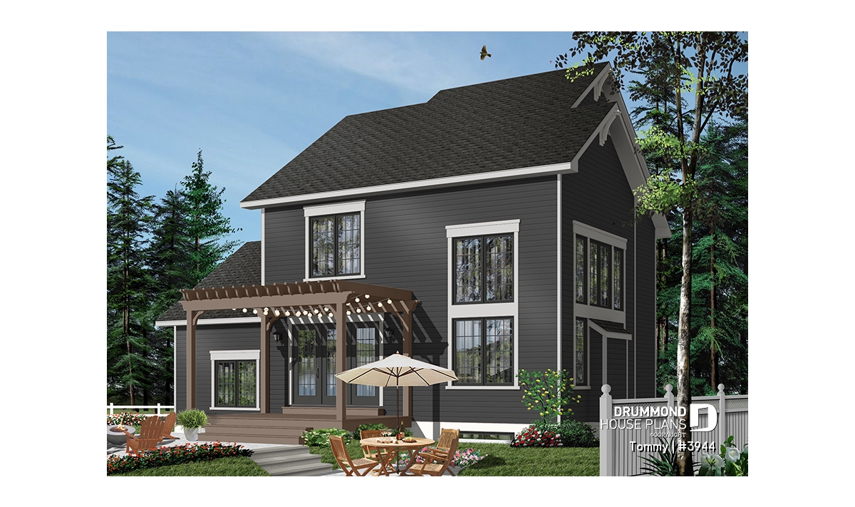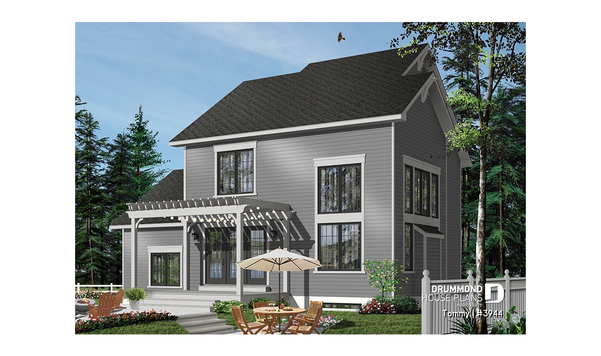Rear terrace suggesting an interesting pergola. Two-storey living room with amazing fenestration and well located fireplace. Two-storey front entry. Master bedroom on first level.