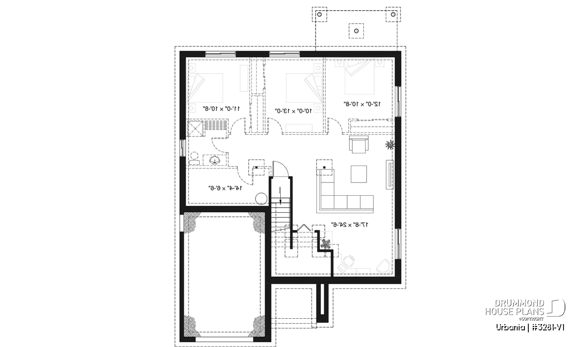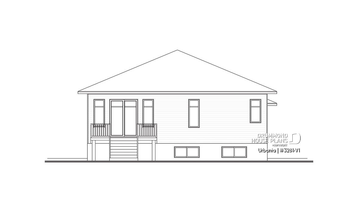 The higher foundation permits larger basement windows with no window wells and the 14’ x 7’ mezzanine/storage area in the garage will increase the space available for seasonal items. The large window above the garage door enhances the natural lighting to the extra space in the garage of plan 3281-V1