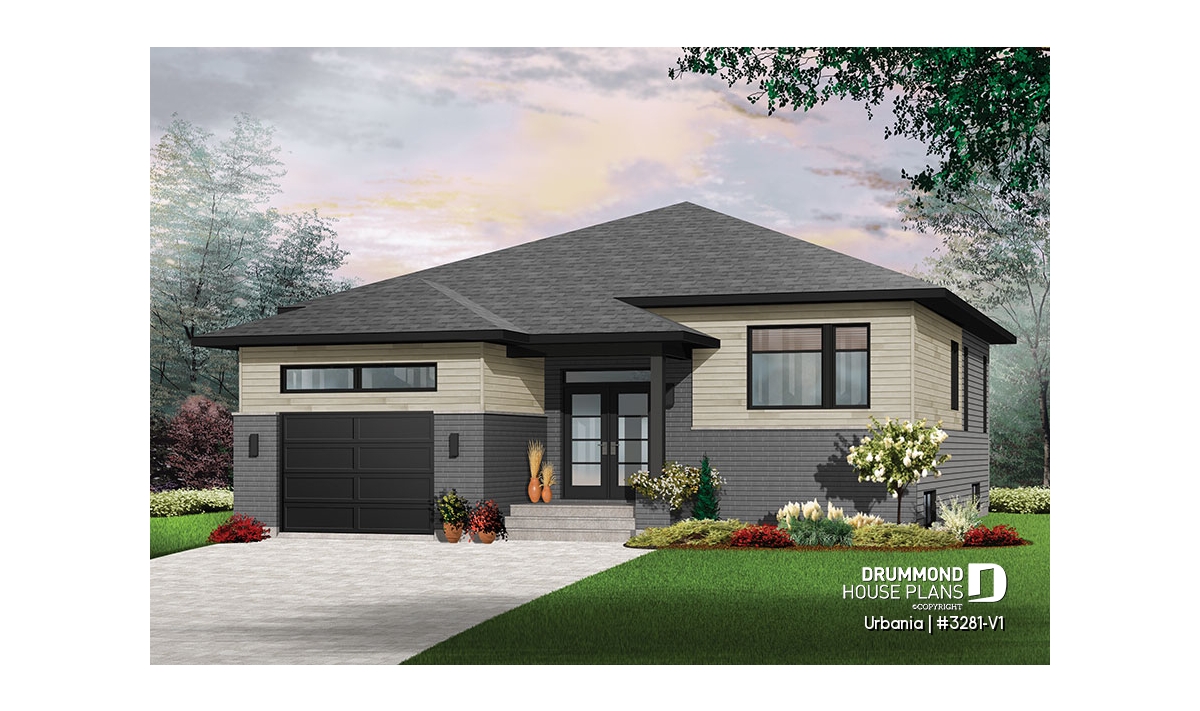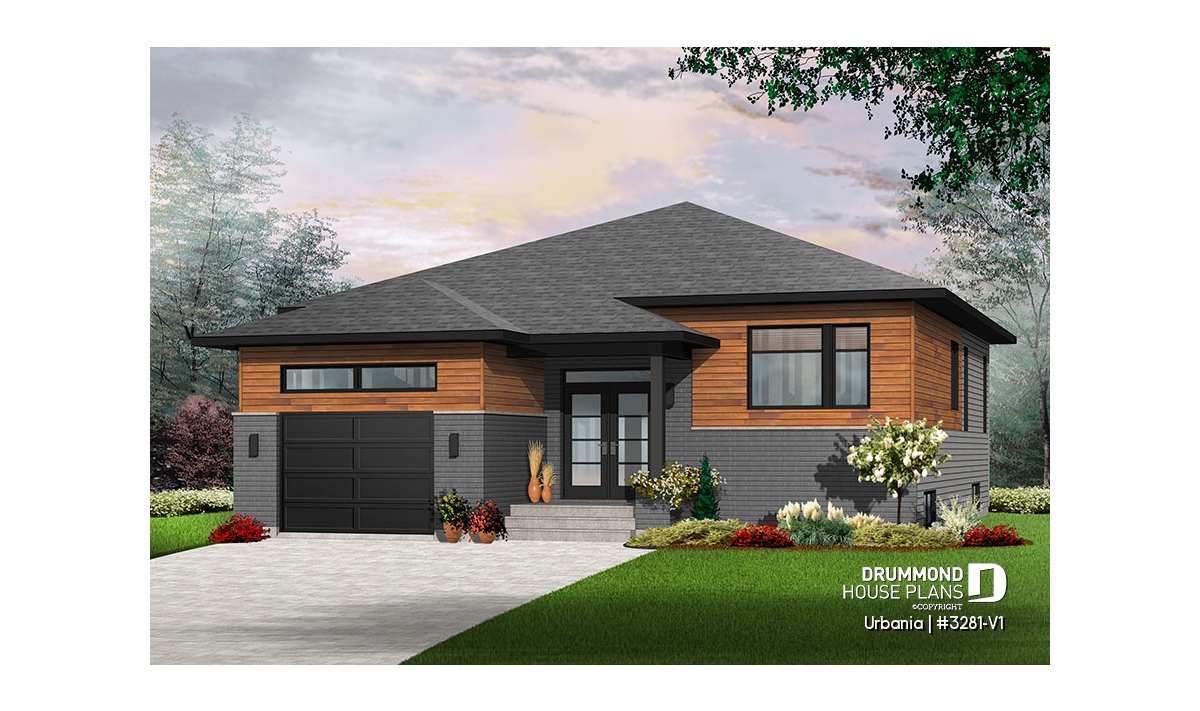 Modern rustic home plan with a one-car garage.