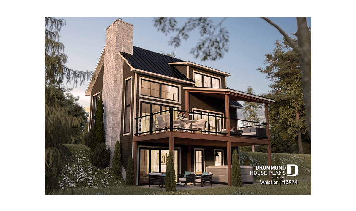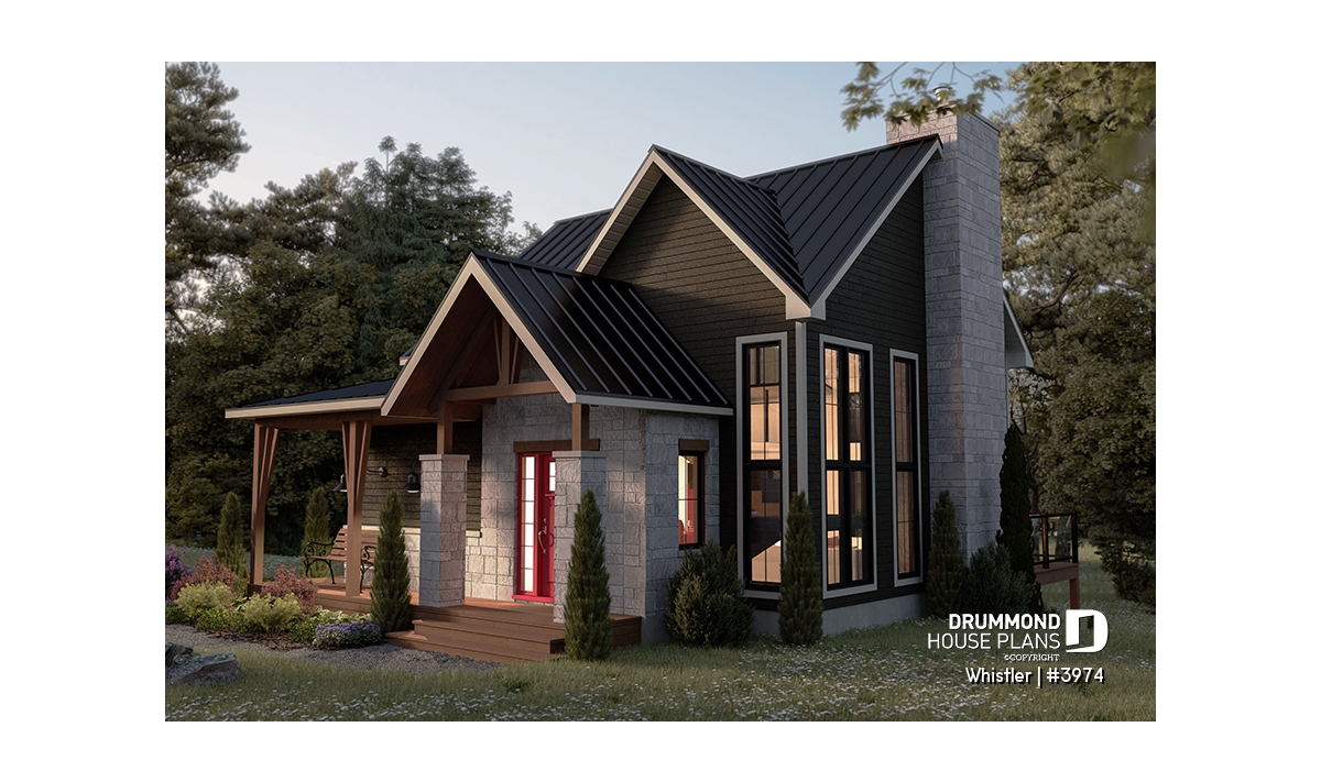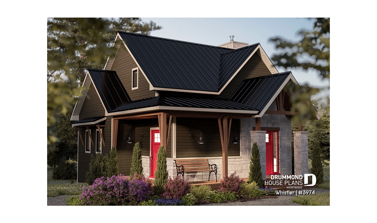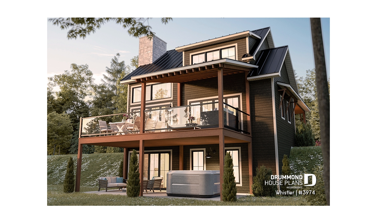 House plan WHISTLER (#3974) is remarkable for its small rustic cottage look and ski lodge style. With finished spaces on 3 floors, including a walkout basement, it nevertheless offers all the spaces required for a family of 4 people!