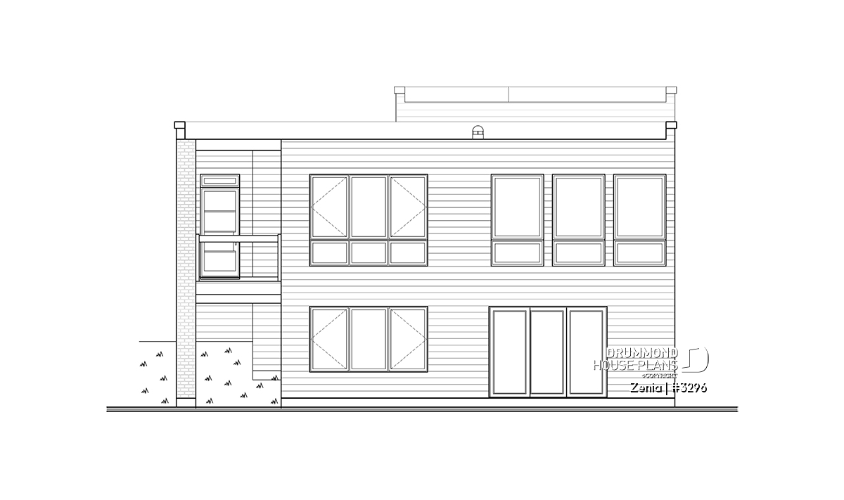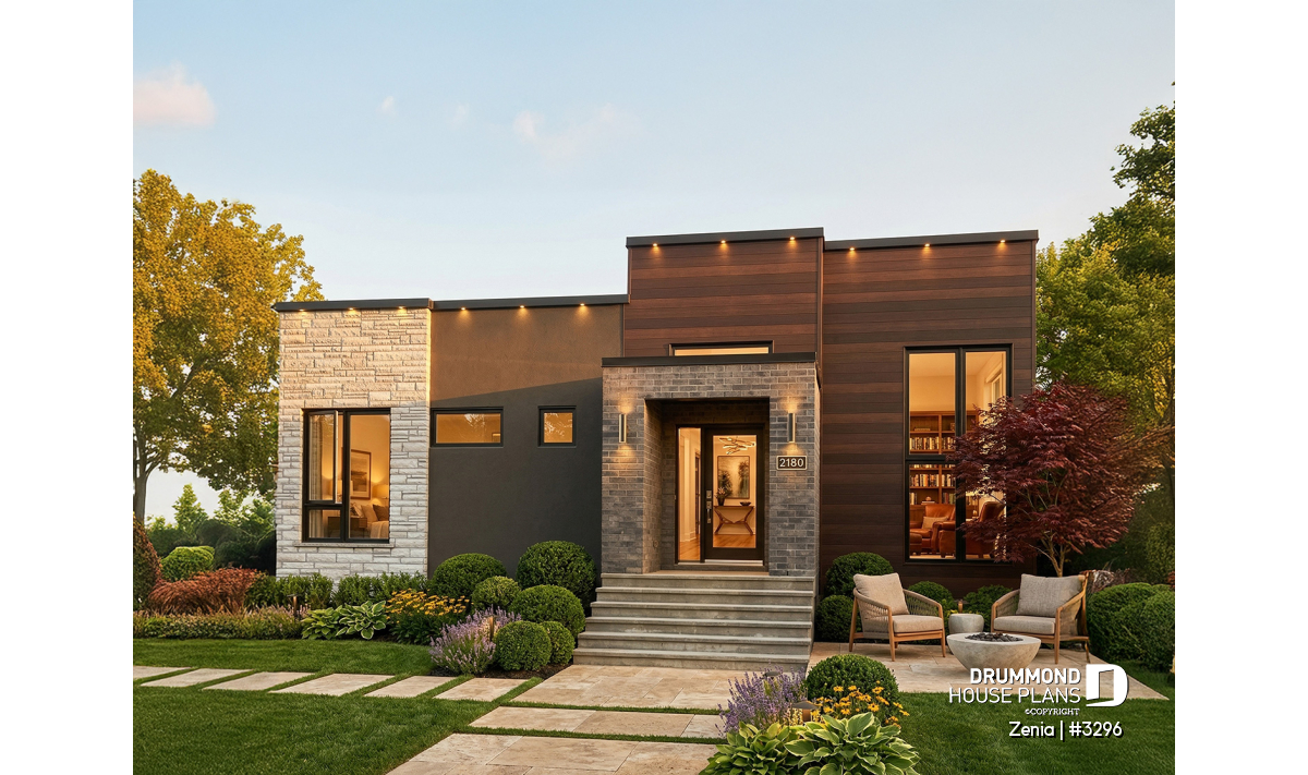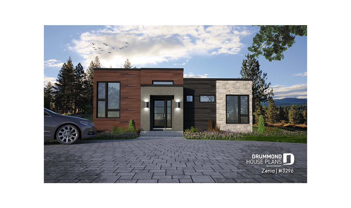 Cube shaped Modern style house plan with very trendy exterior coatings and colors like two-tone wood and gray stone.