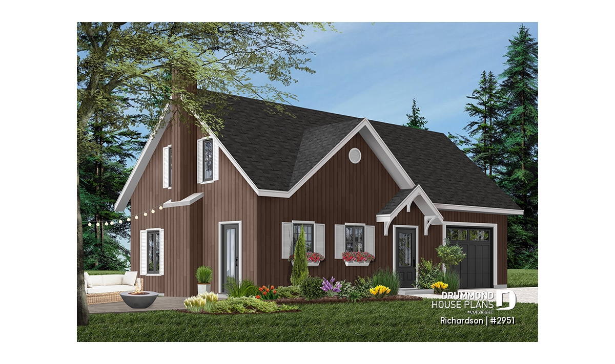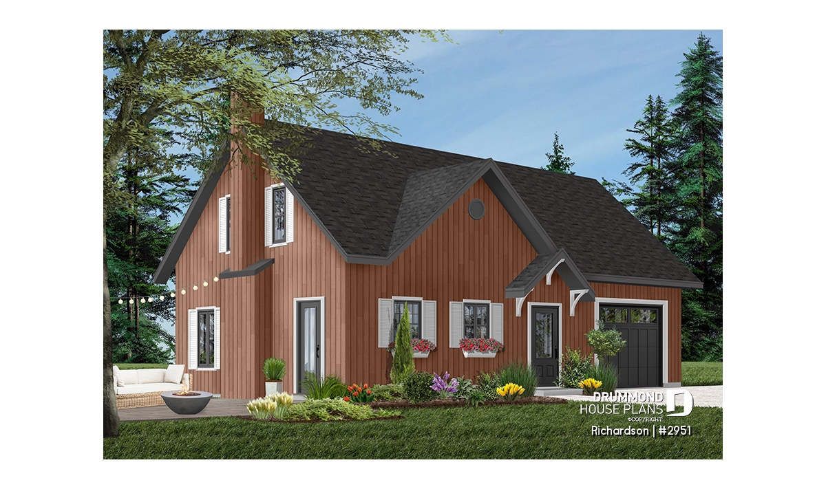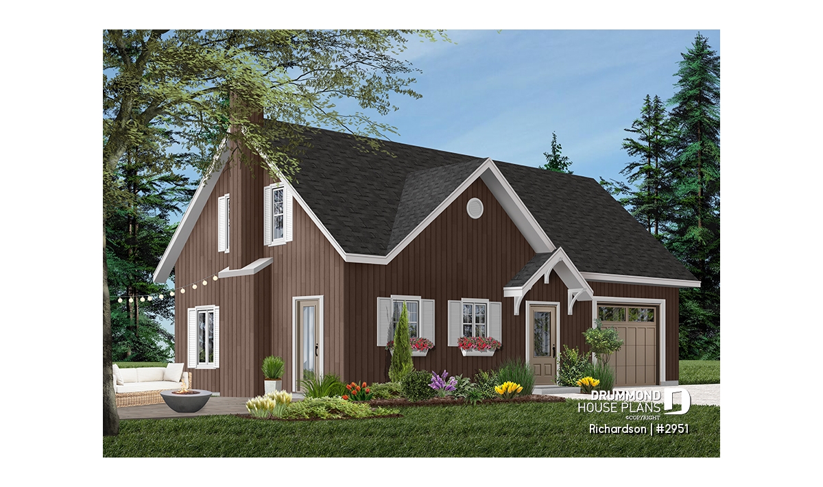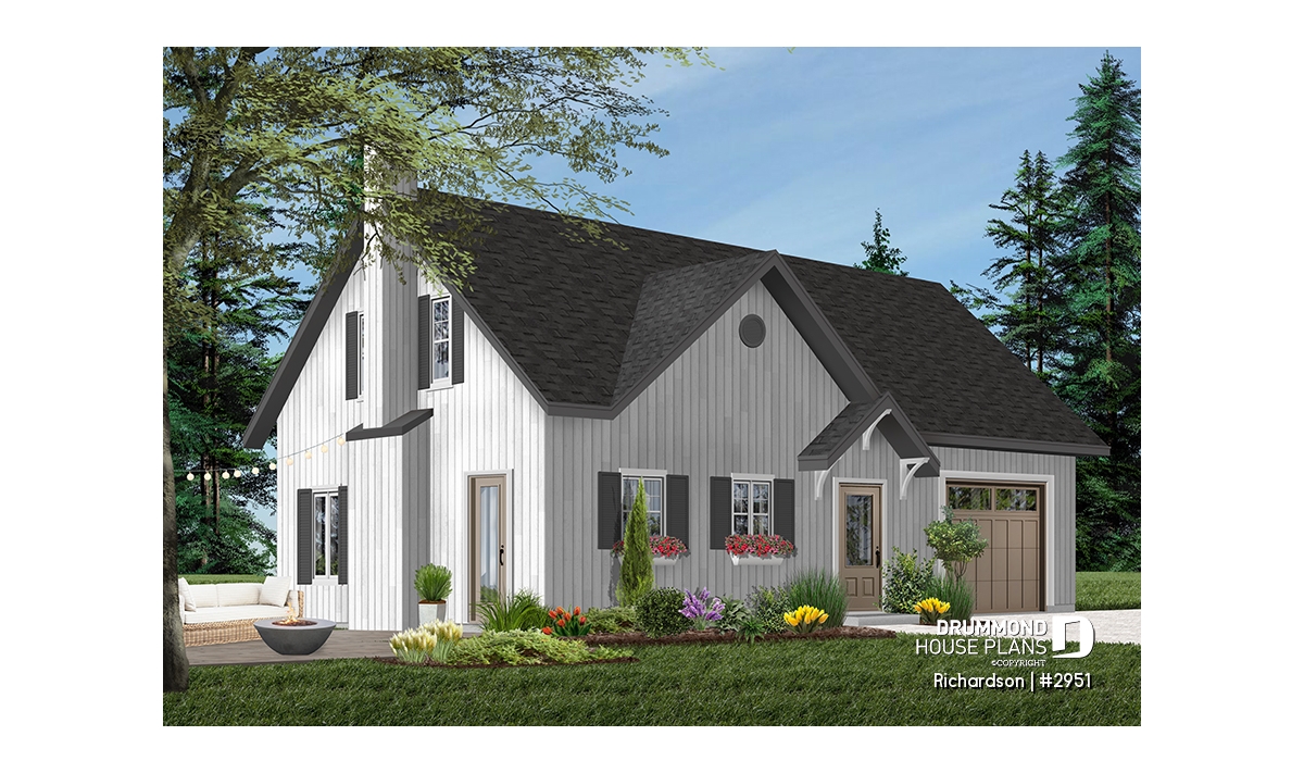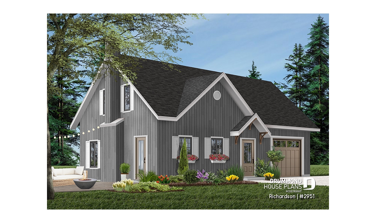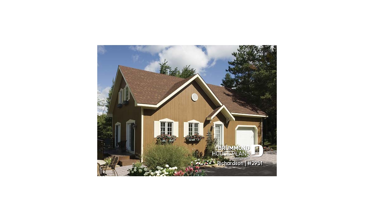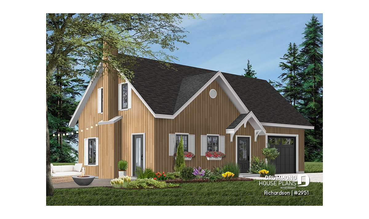 Rustic cottage house plan, open floor plan with fireplace, 3 bedrooms, garage