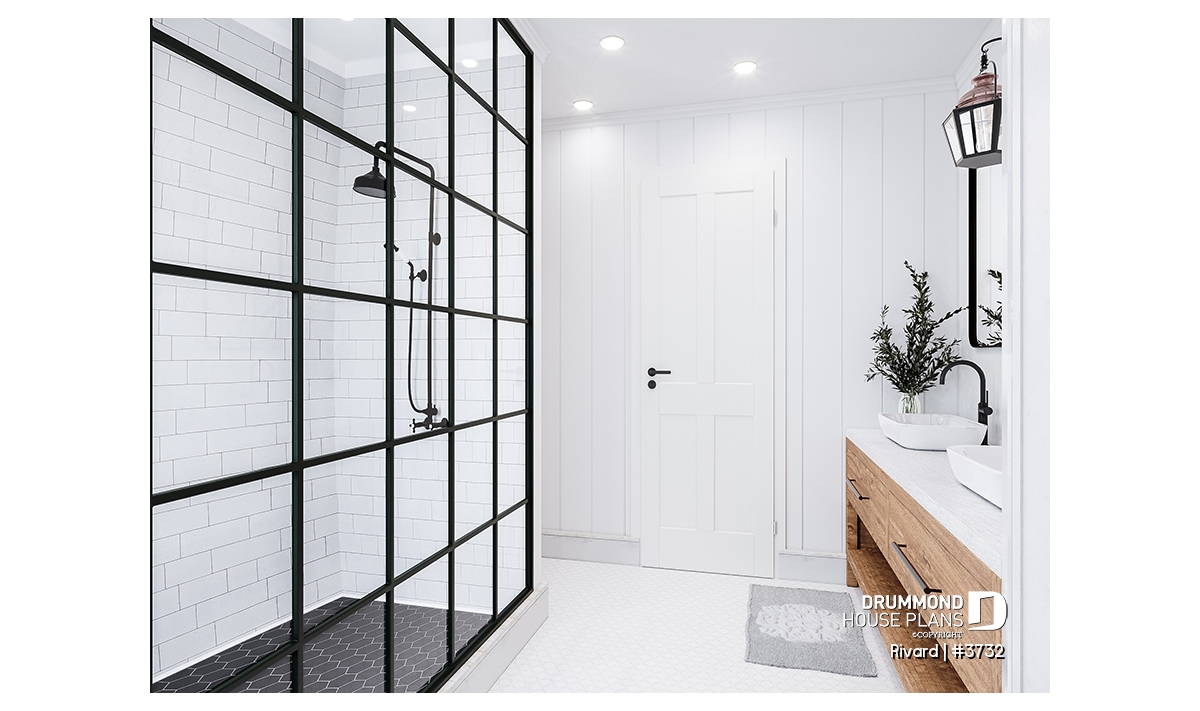 Large master bedroom with walk-in closet and private bathroom. The latter offers 2 sinks and a large shower.