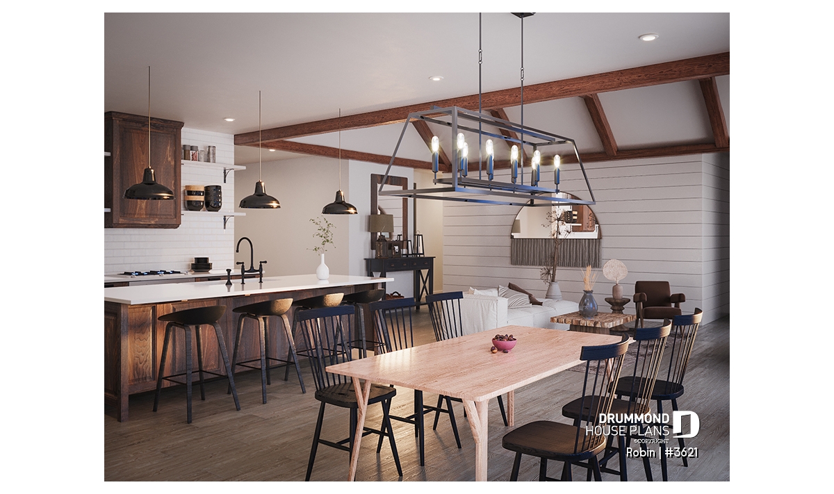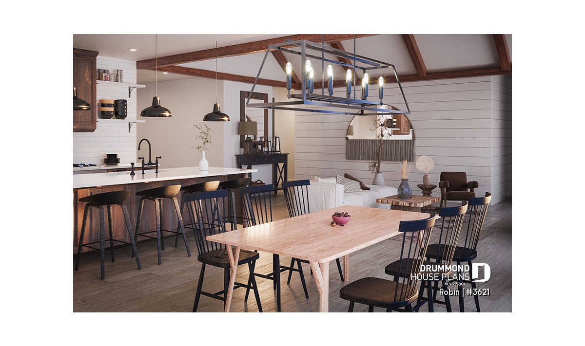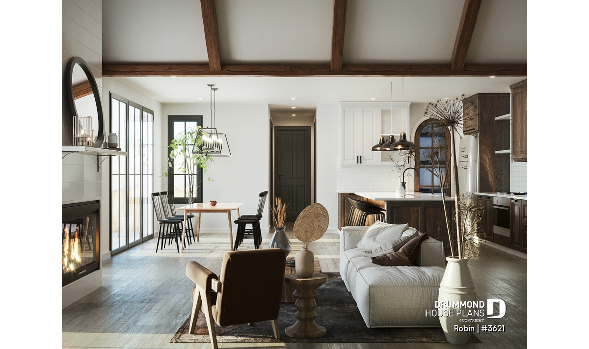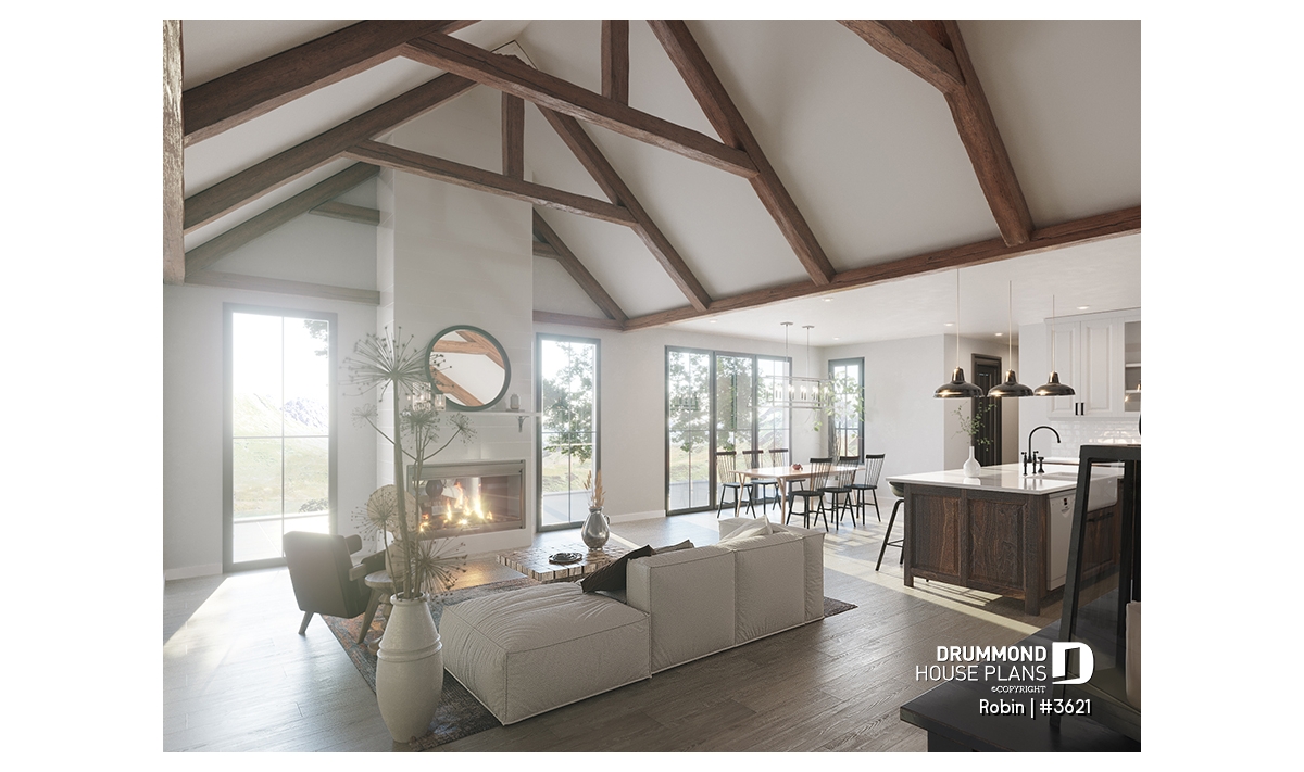The ROBIN Model (#3621) offers 3,009 sq. ft. of living space spread over two levels, a spacious double garage, and a covered rear porch with a 12'9" ceiling accented by decorative faux beams.
