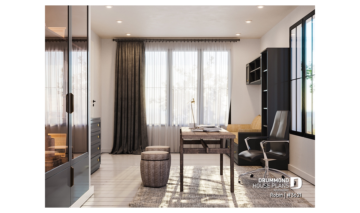 Private home office, set apart from the main living areas, featuring an independent exterior entrance and adjacent powder room — perfect for remote work or a home-based professional.
