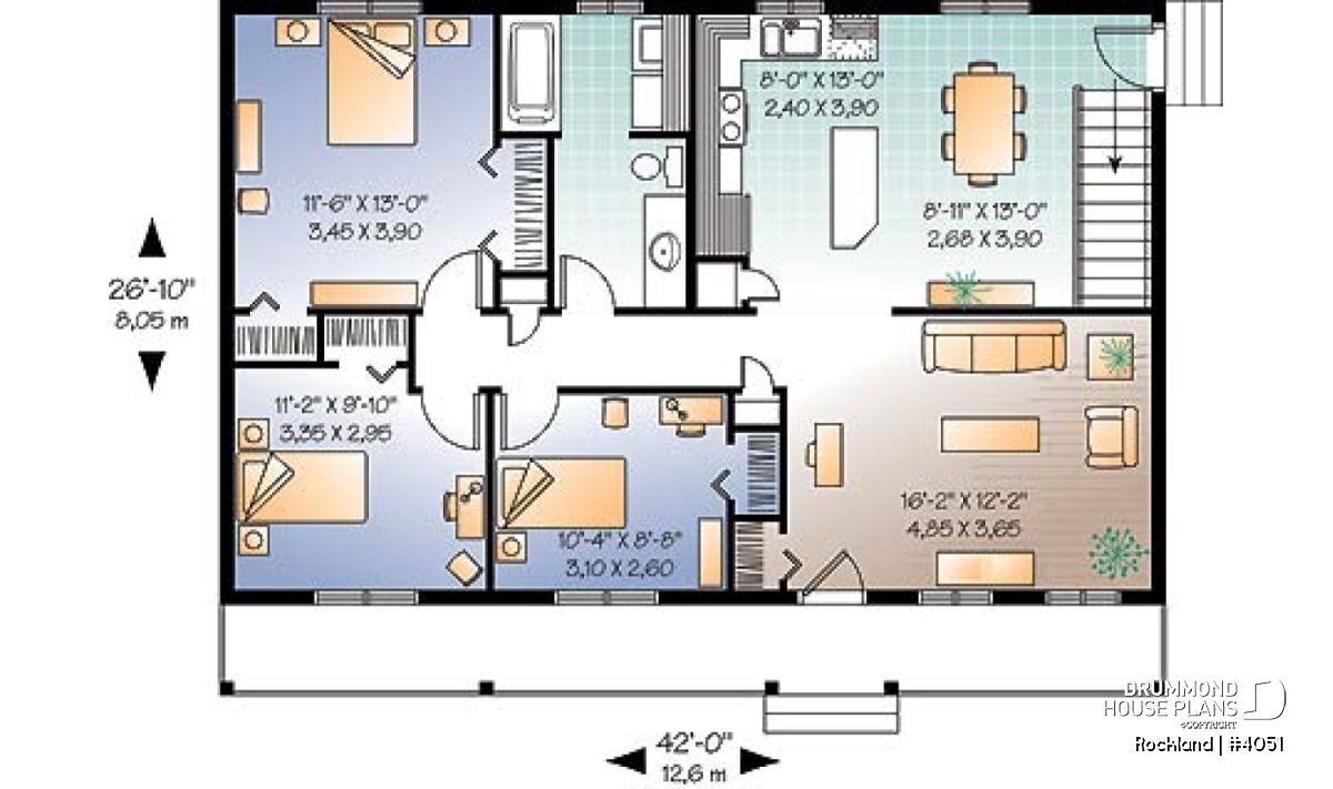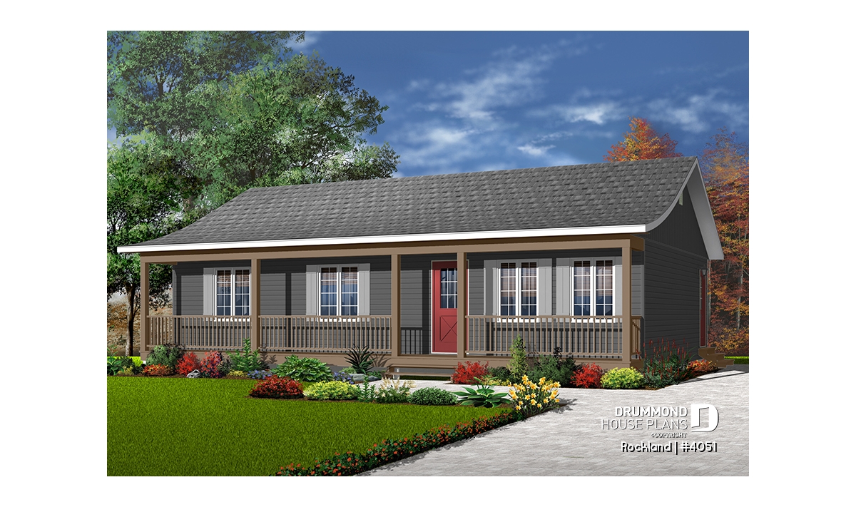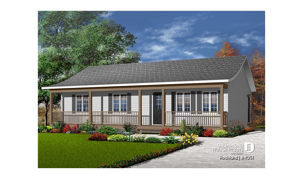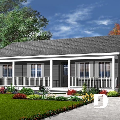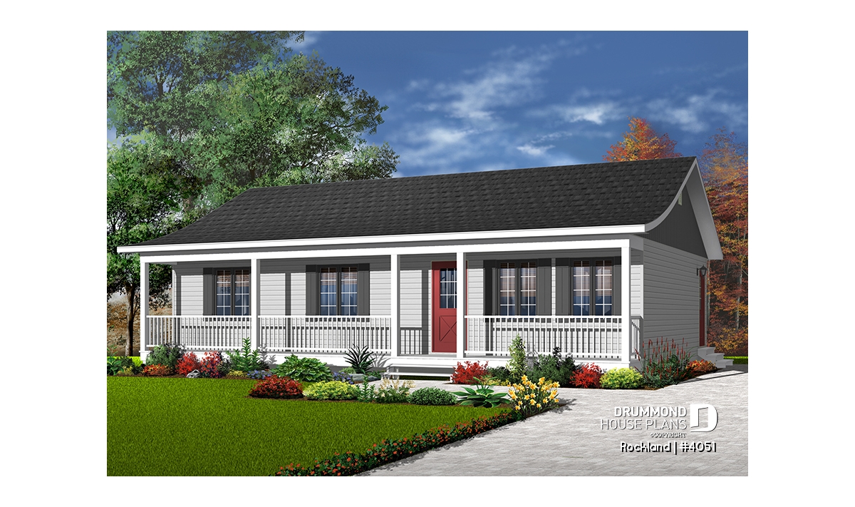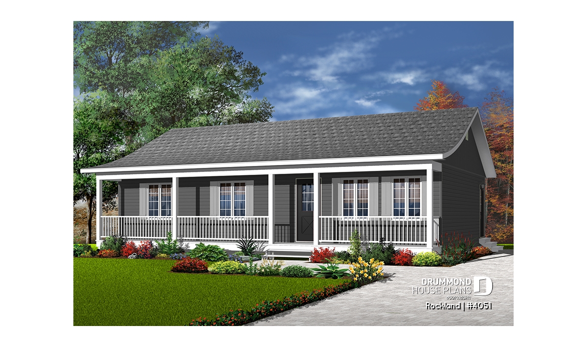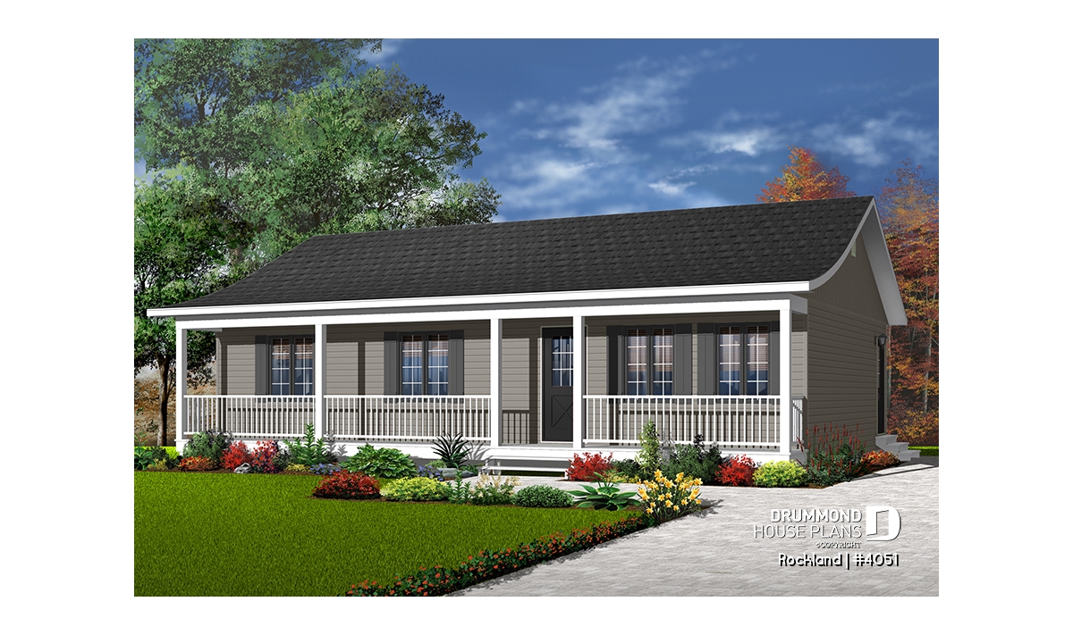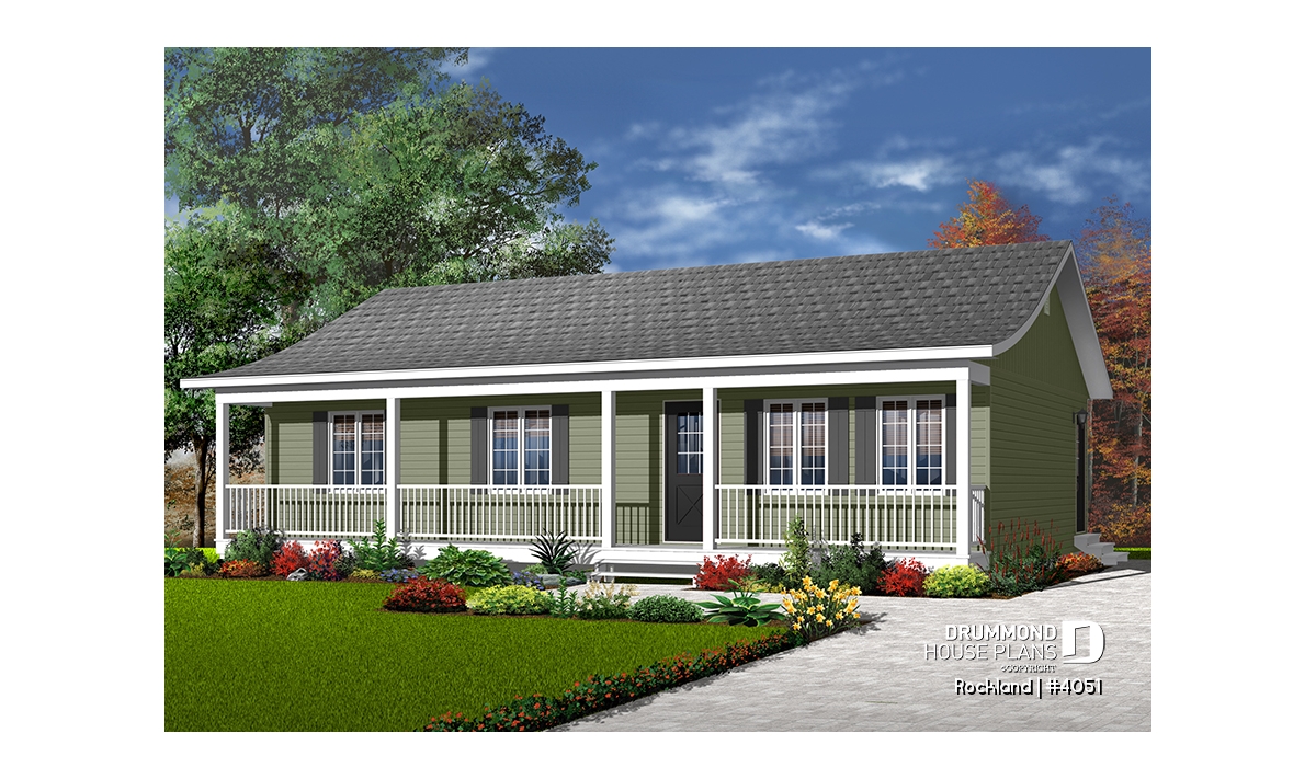 A 4ft deep covered porch adorns the entire length of this rancher. Shuttered windows and picket railing dress up this rancher which, due to simplified construction, is very economical to build.
