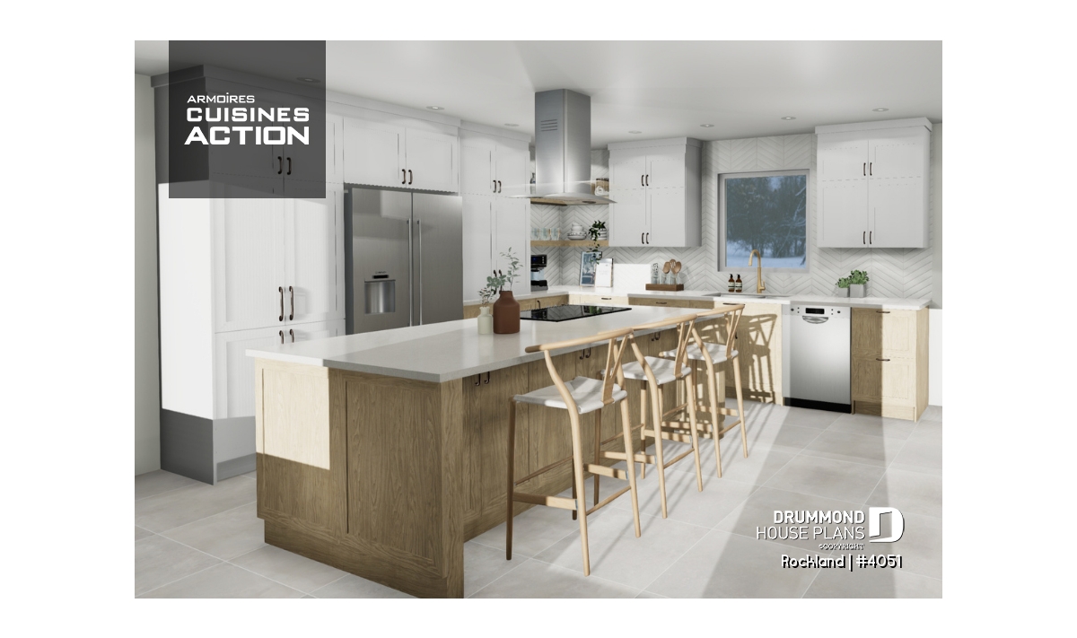 A kitchen with island are adjacent to the dining room and side door. The forward-oriented living room is private from the dining area. Three bedrooms occupy their own wing and share a family bathroom complete with laundry.