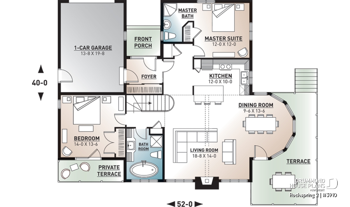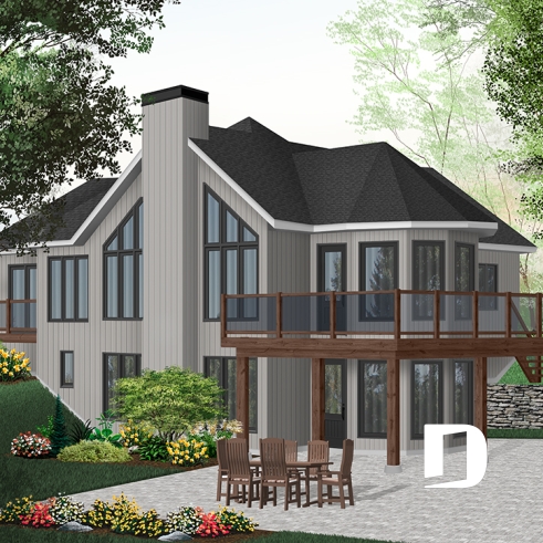 Attached garage (see back elevation), abundant windows in activity area, living room with fireplace and vaulted ceiling, dining room housed in windowed turret.