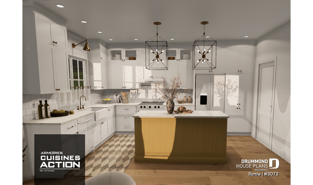 The kitchen offers a large island as well as a pantry and is open to the dining room and the living room.