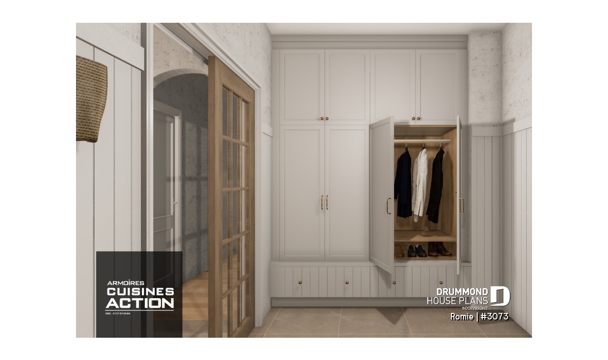 Large entrance with coat closet and bench, accessible from the front entrance and the garage.