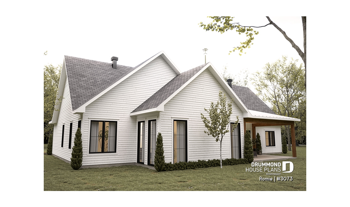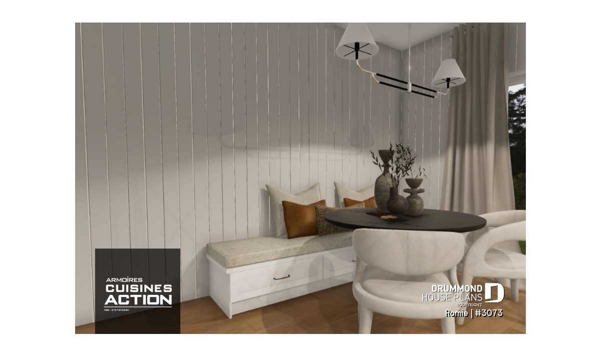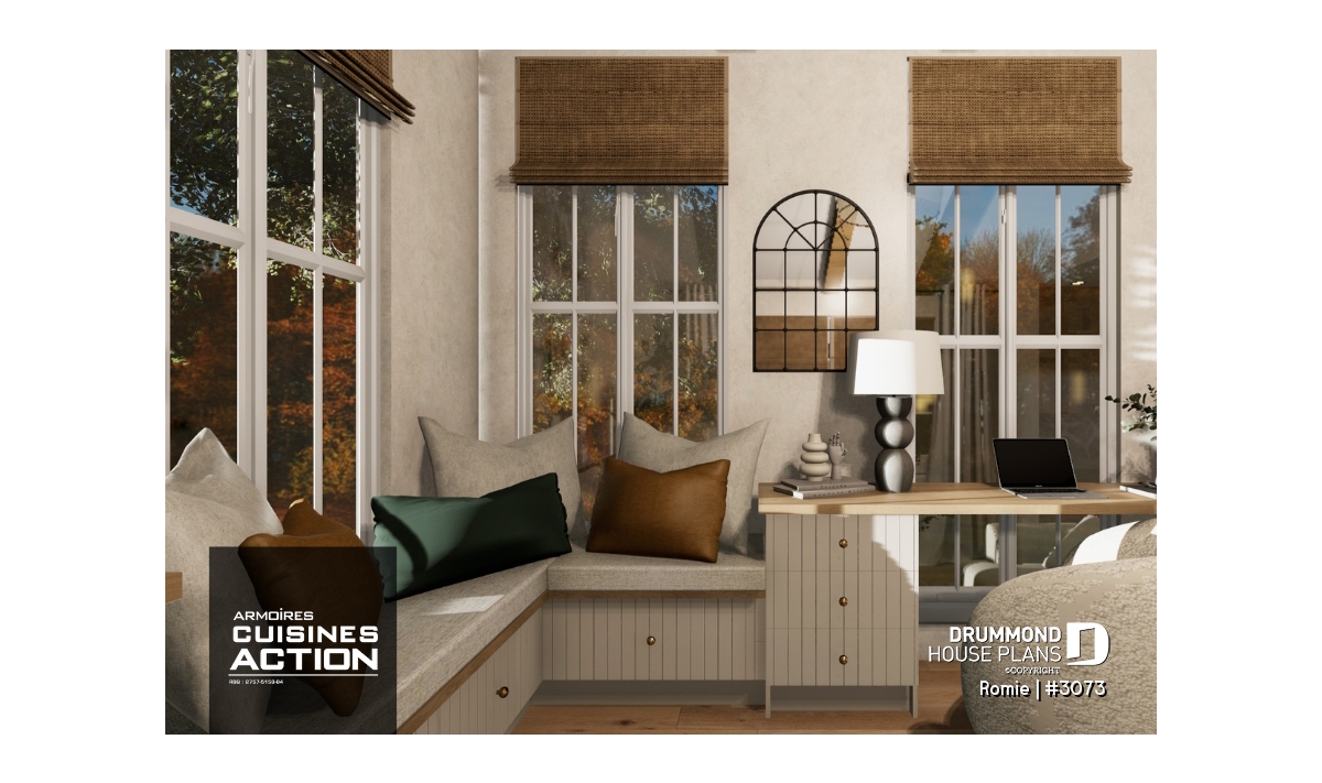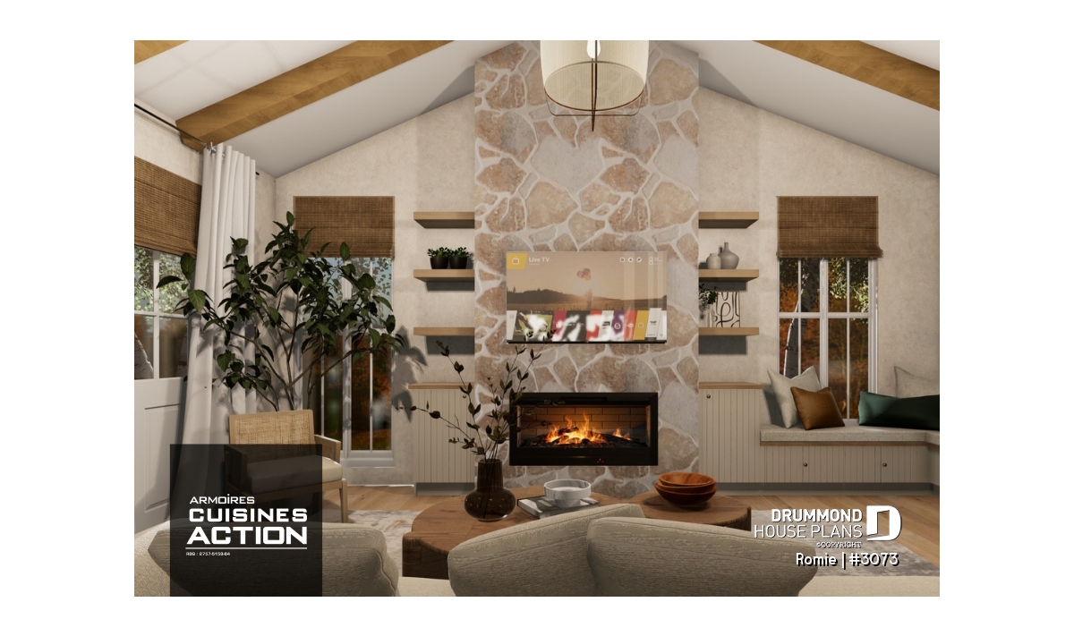 The living room offers a fireplace, a cathedral ceiling, a small bench and a planning desk area. In addition, this area also gives access to the sheltered terrace.