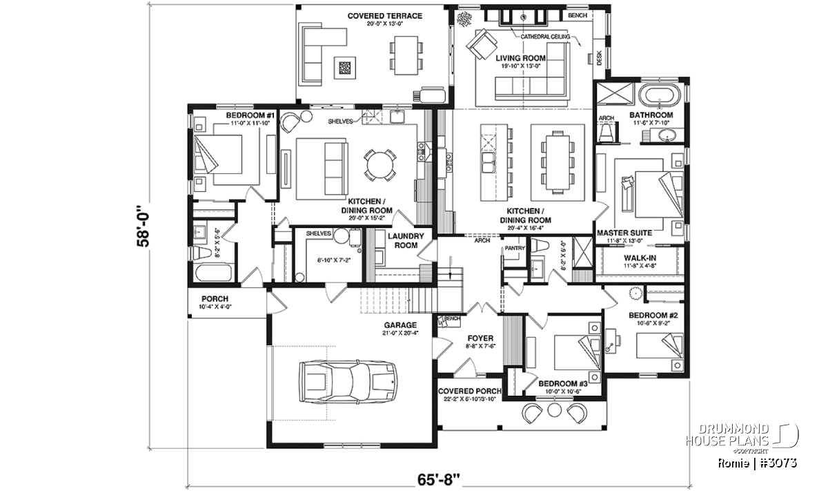 Cathedral ceiling, Fireplace, Covered patios, Covered patios, Pantry, Side load garage, Bench seat(s), Island, Walk-in master bed., Separate bath and shower, Open floor layout, Open floor layout, Built-ins, Oversized garage, Shelves, Split bedrooms, Planning desk, Arch