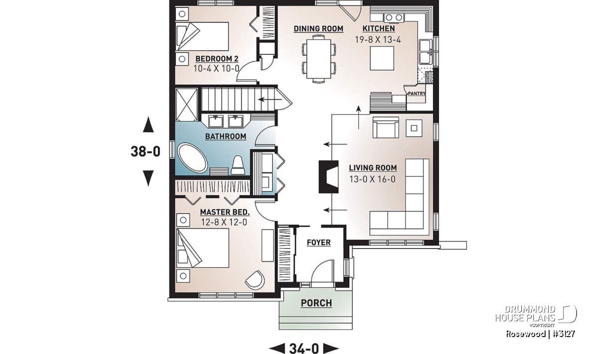 Within, a weatherlock entry leads to a central corridor. To the right, an intimate sunken living room gains an extra 6 inches in ceiling height and is warmed by the fire’s glow. The efficient U-shaped kitchen and adjoining dining room are bathed in light from a double garden door - an ideal exit to enjoy the back yard. Two bedrooms are divided by a hall laundry closet and 5-fixture bathroom complete with double vanity, spa tub and oversize shower.