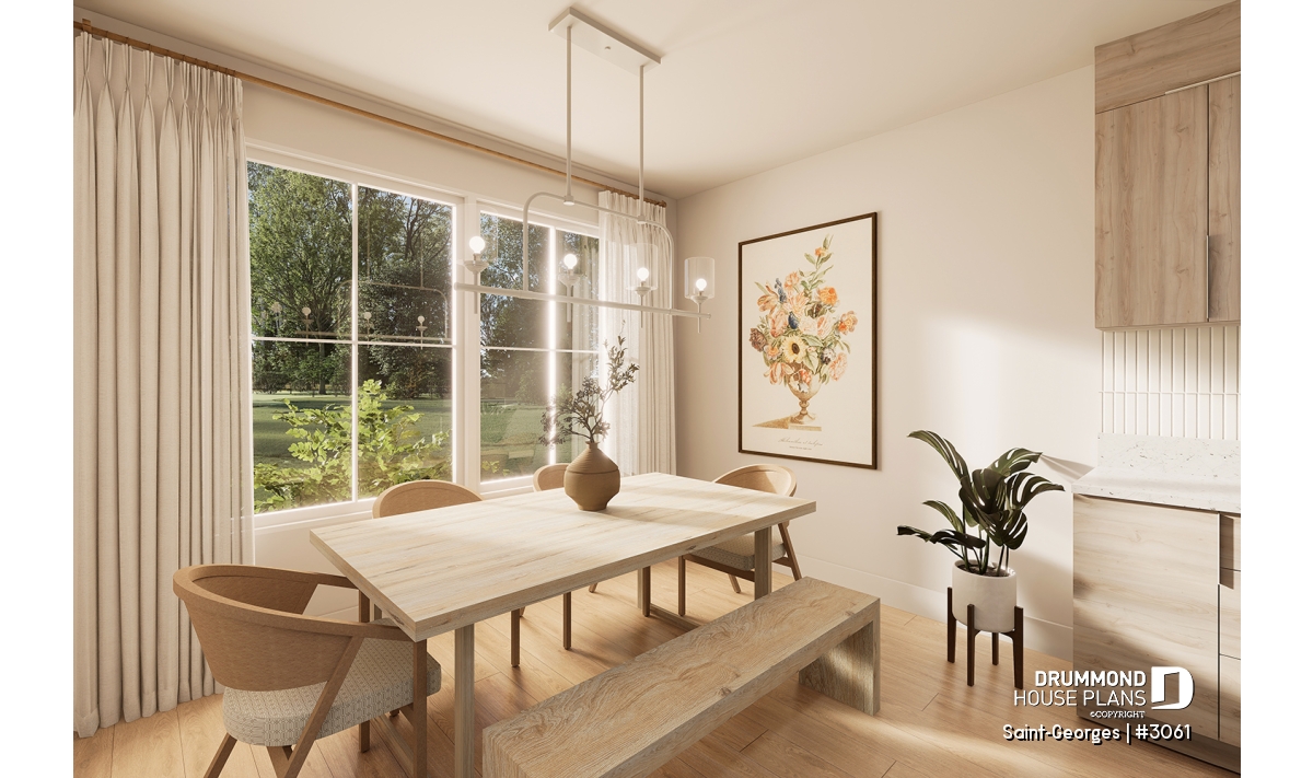 Dining area with a built-in bench, maximizing square footage.