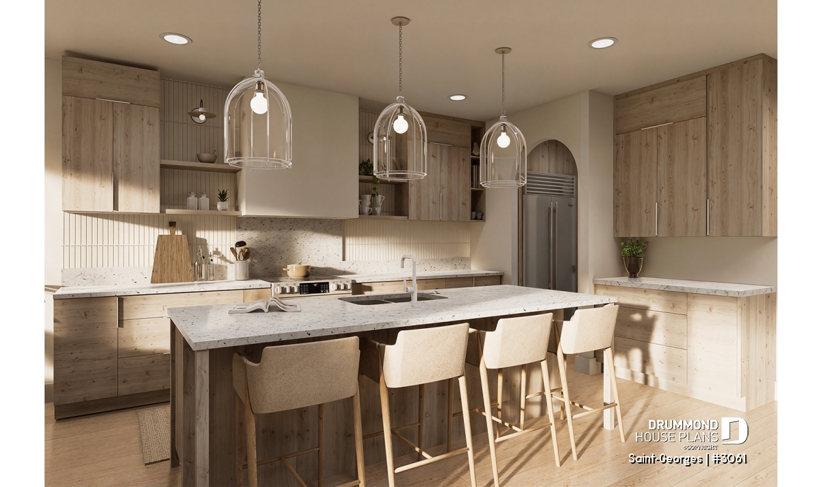 Several decorative architectural arches set the tone for the warm, inviting interior of this farmhouse-style intergenerational home.