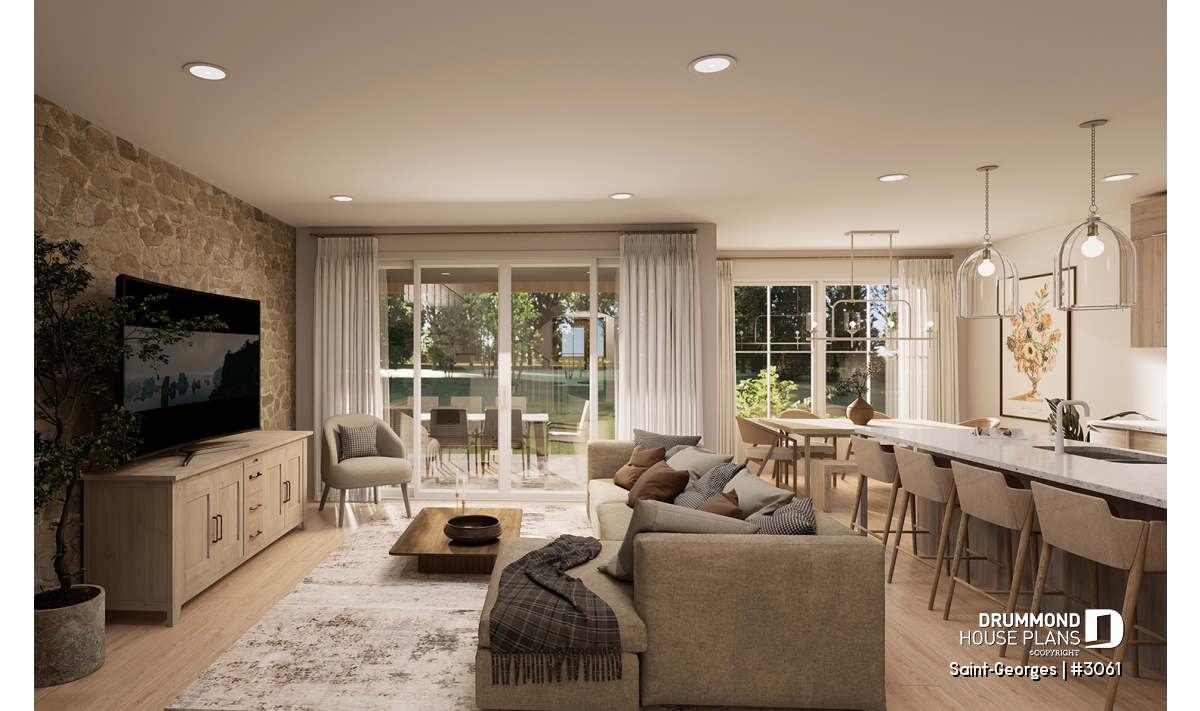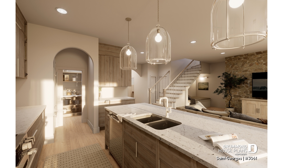 Open-concept living room and kitchen, featuring a large, friendly central island and a walk-in pantry.