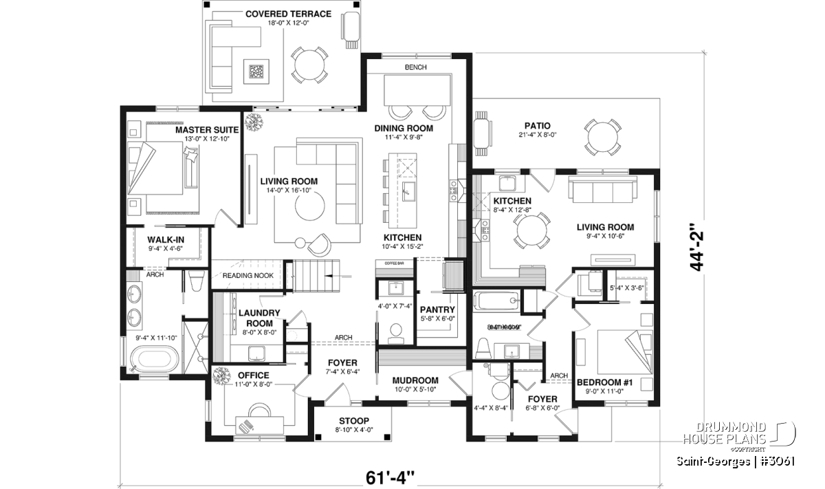 Arch, Open floor layout, Pantry, Ceiling over 8', Covered patios, Gound floor laundry room, Walk-in master bed., Island, Bench seat(s), Separate bath and shower, Double sinks, Office / Study / Den, Master suite on main