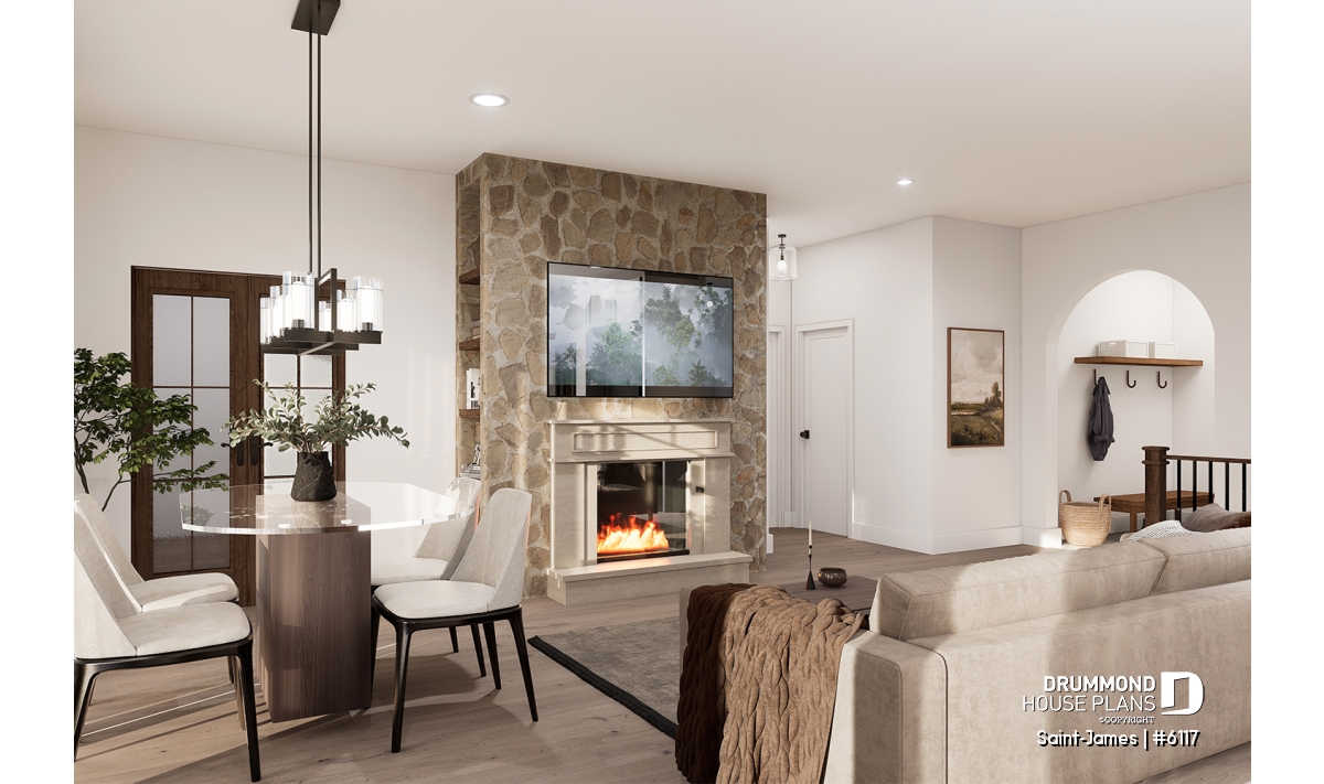 The living room, centered around a cozy fireplace, is the heart of the home — the perfect spot to relax, entertain, or enjoy quiet evenings by the fire. The kitchen features a large central island and a generous walk-in pantry, ideal for both everyday meals and friendly gatherings.
