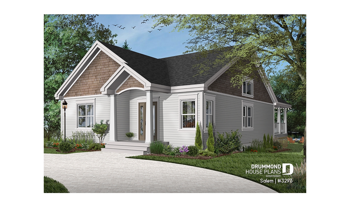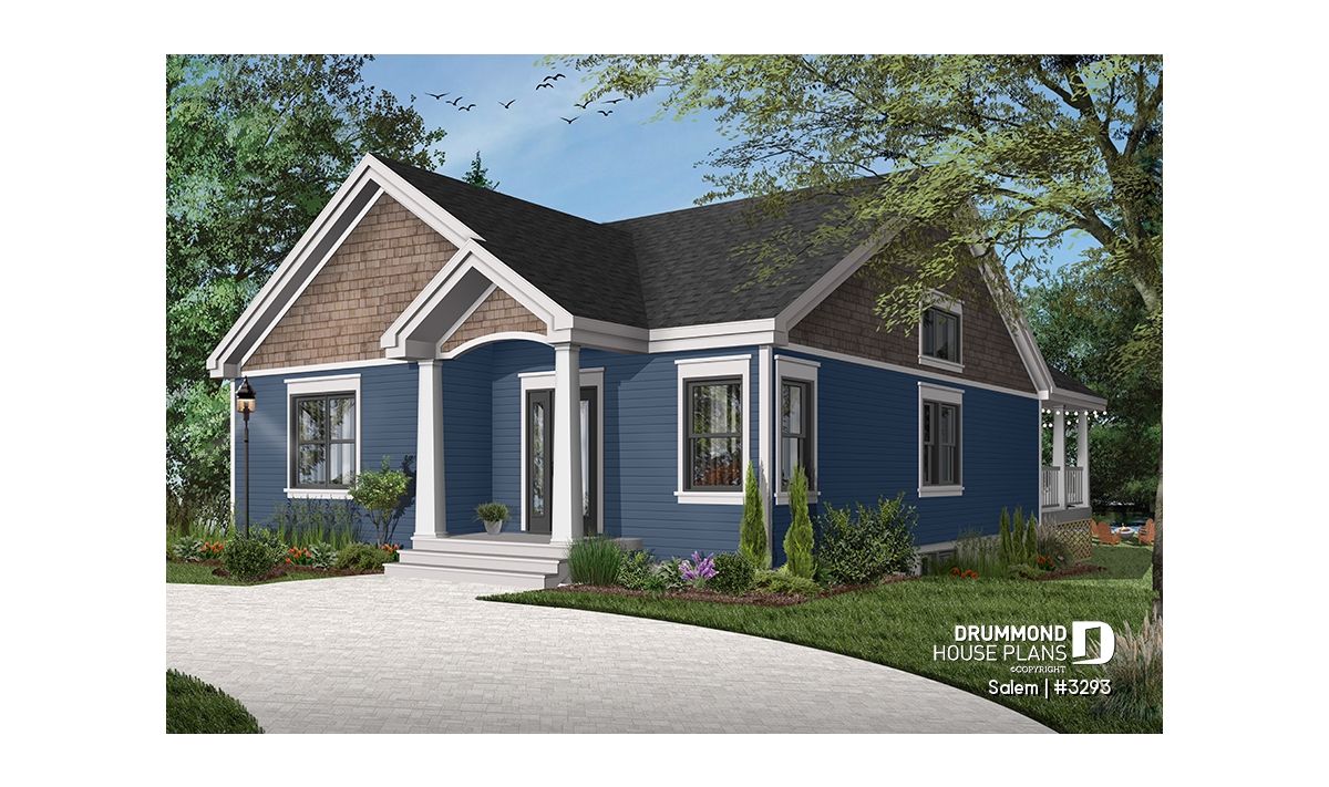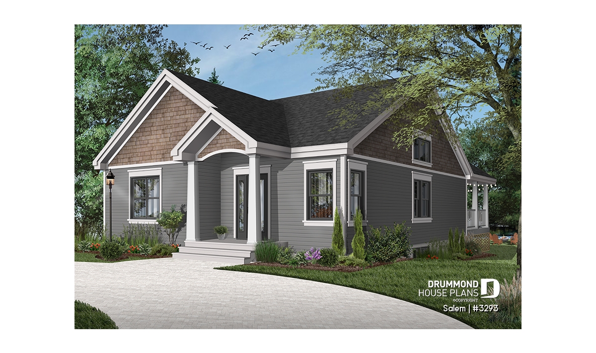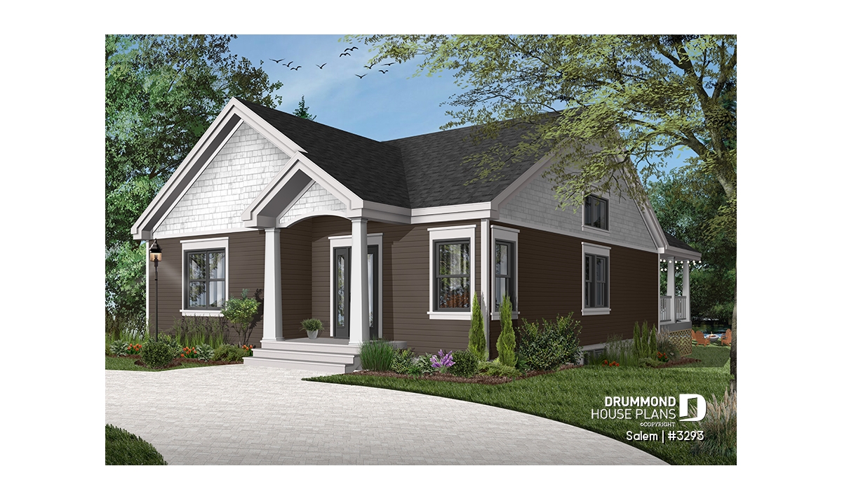 This one story house plan with a rustic modern trendy style, our plan no. 3293 also named Salem, offers an ideal format for narrow lots. In addition, with its 32 feet of front elevation, it has many amenities sought by families or people looking for a home with space for a home office!