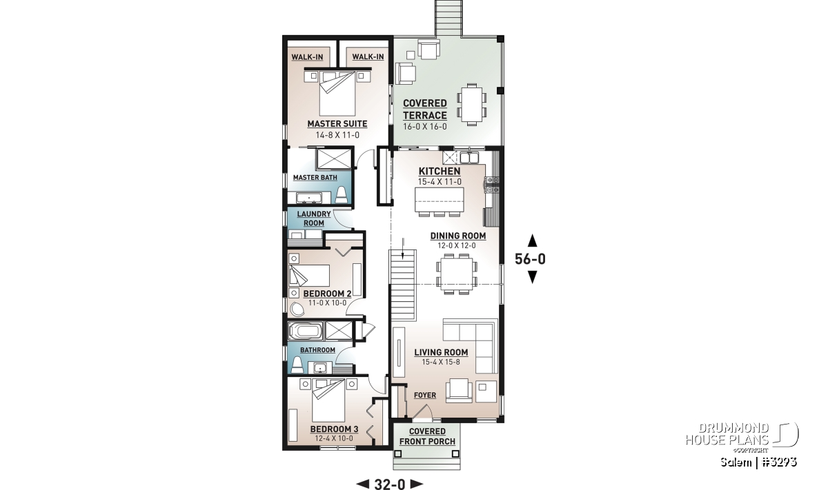 1st level - House plan for narrow lot, covered rear balcony, master suite + 2 secondary bedrooms with full bath, cathedral - Salem