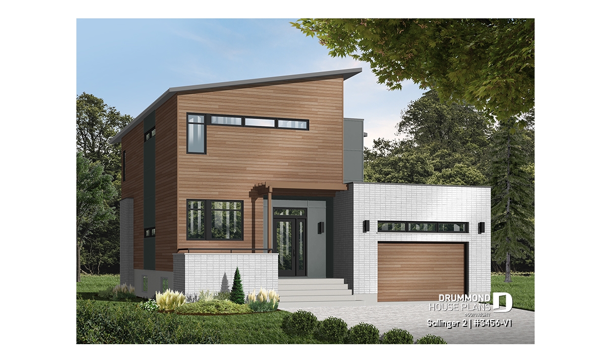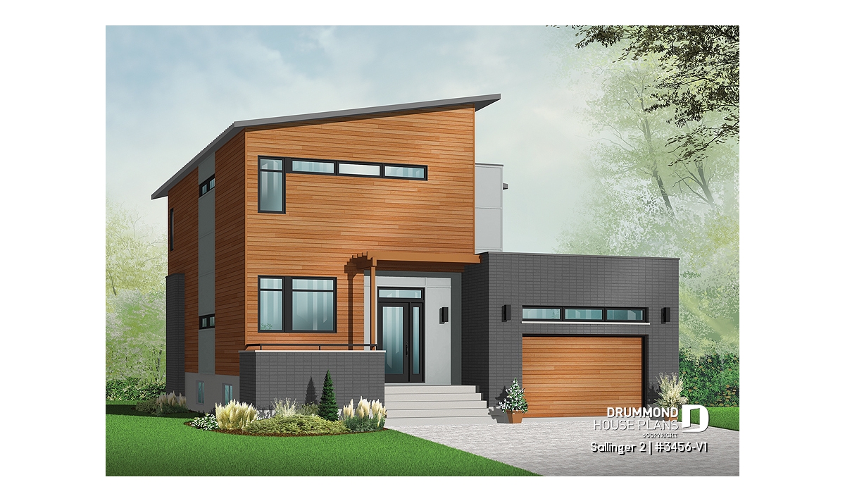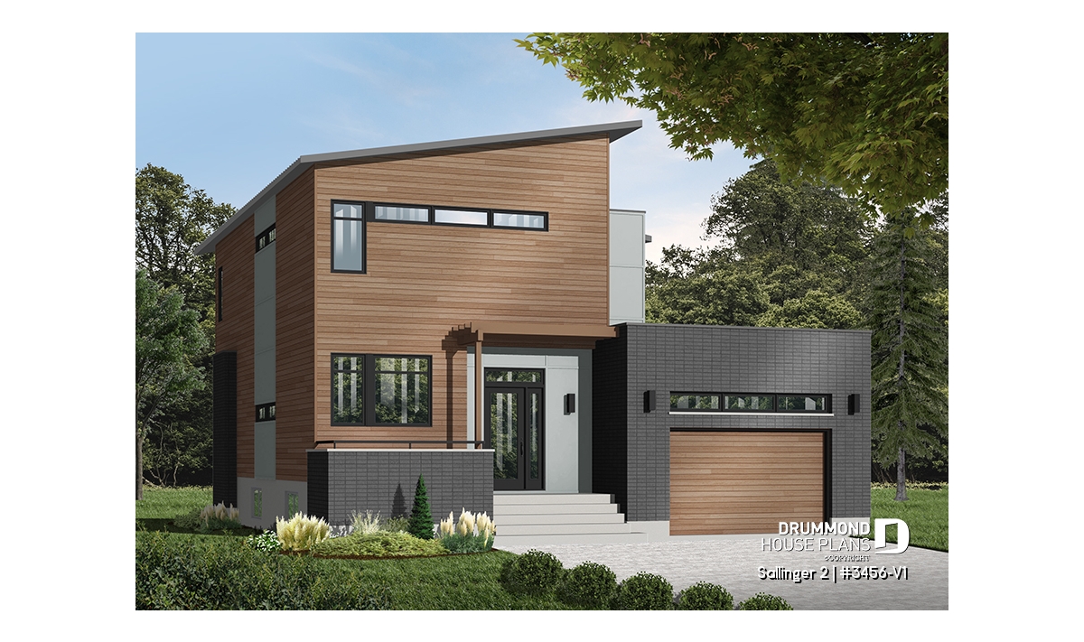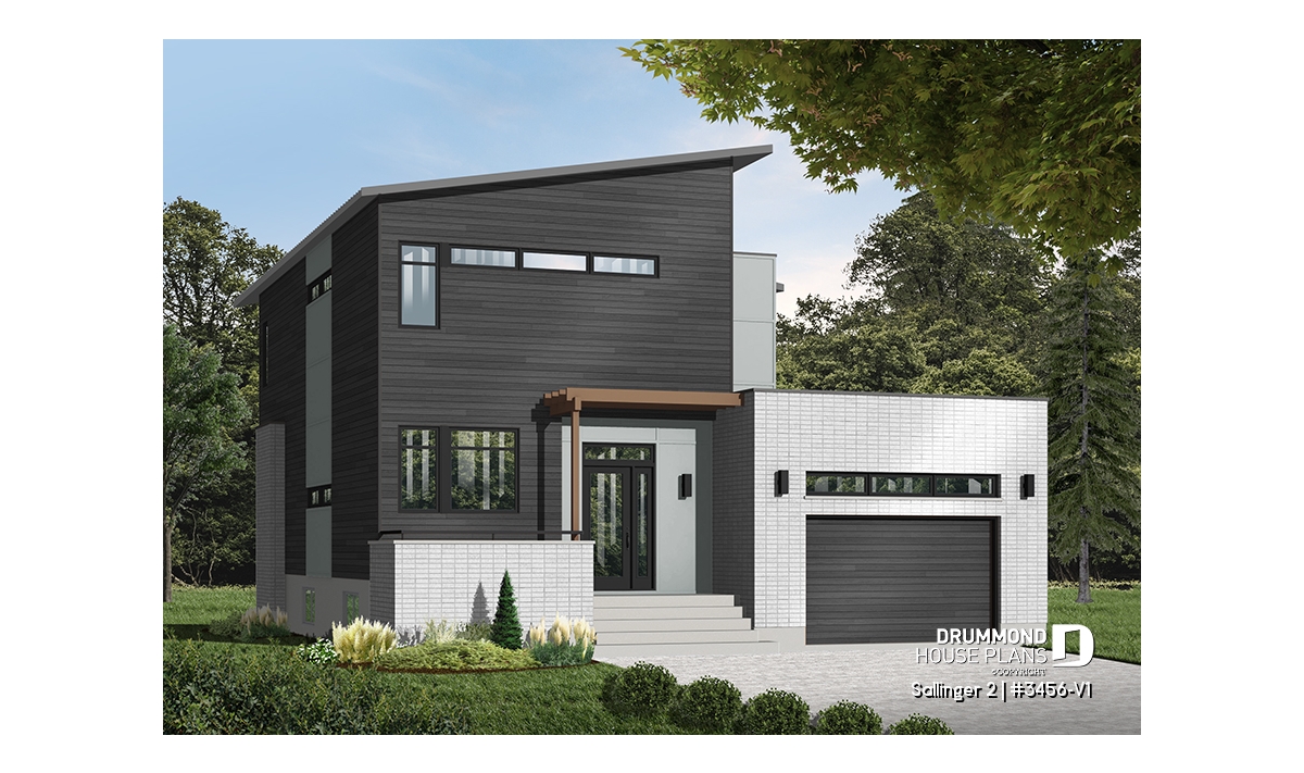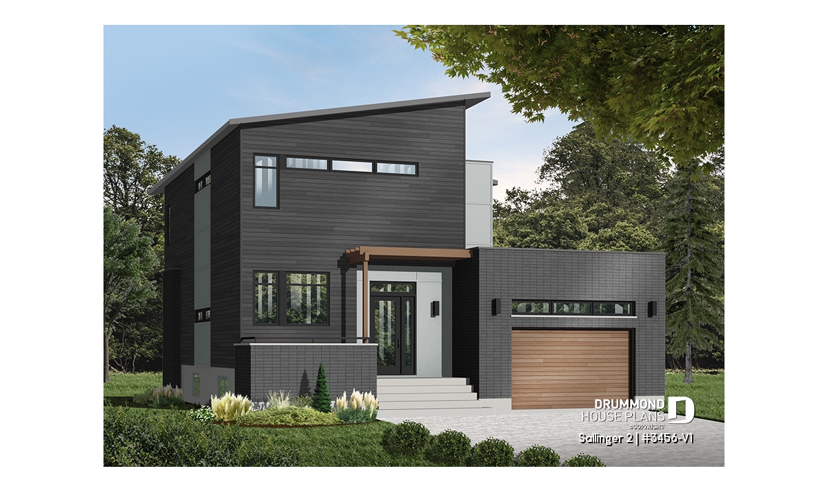 front - BASE MODEL - Striking 3 bedroom contemporary house plan with home office, open floor plan with fireplace and garage - Sallinger 2
