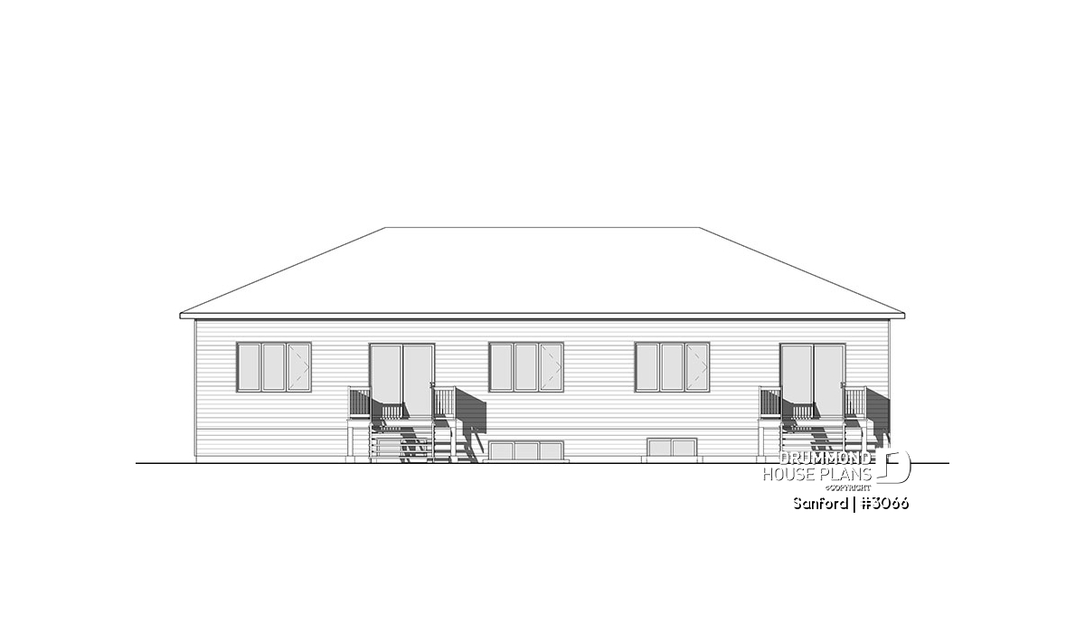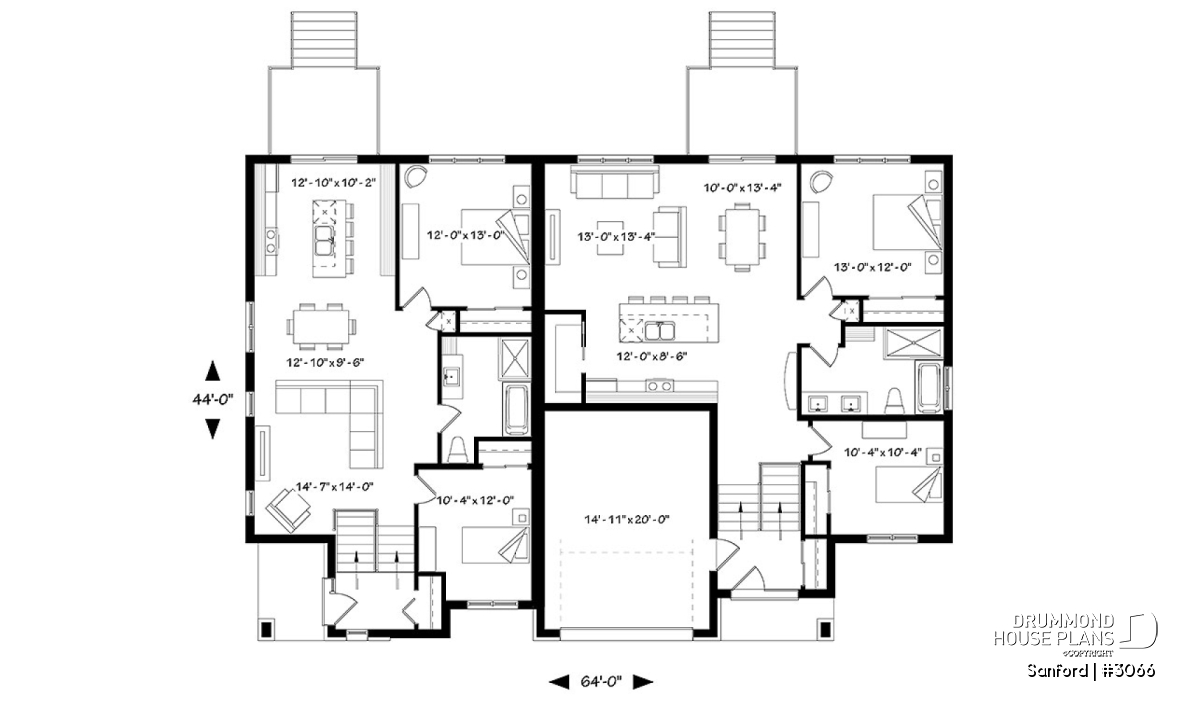 Multi-family duplex house plan with a one-car garage on one unit.