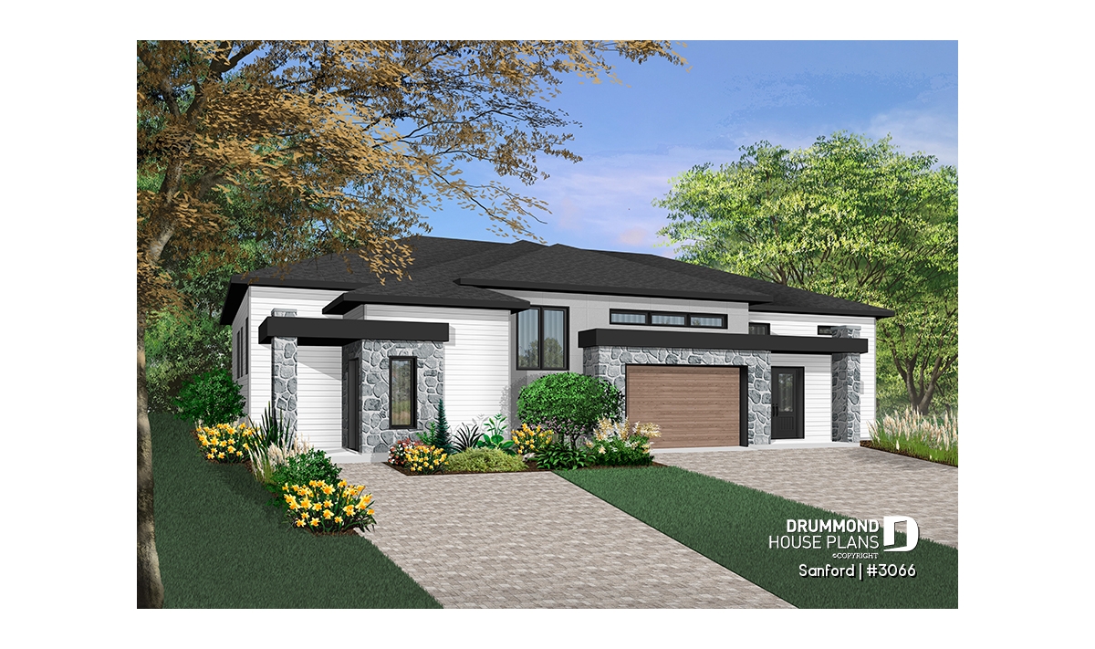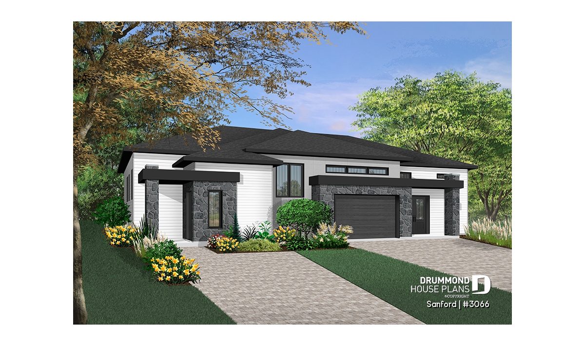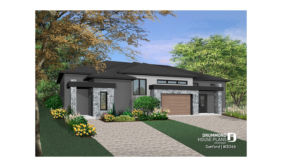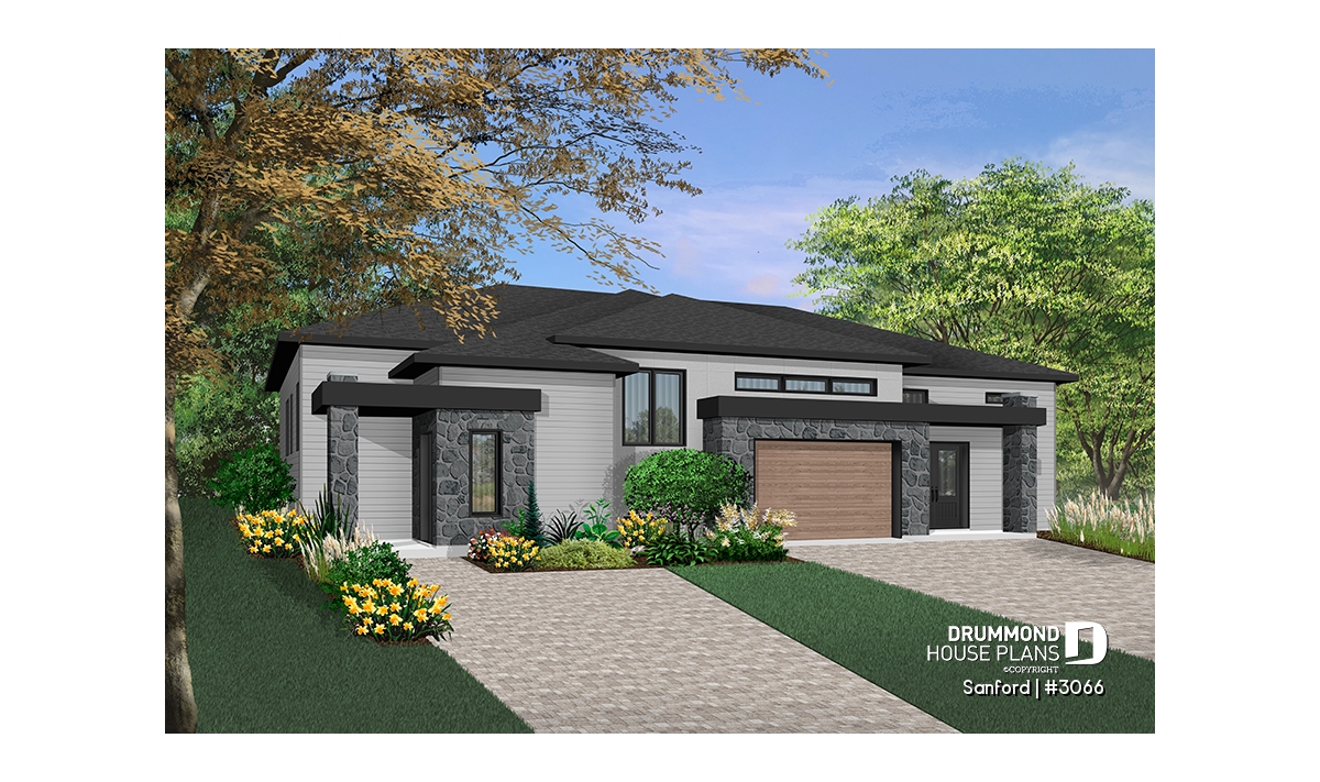 While the exterior suggests a contemporary style design, much appreciated by today’s young homeowners, the interior offers a smaller left unit and a more spacious right unit with a single-car garage.
