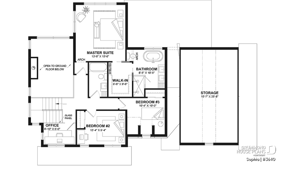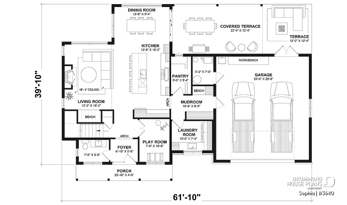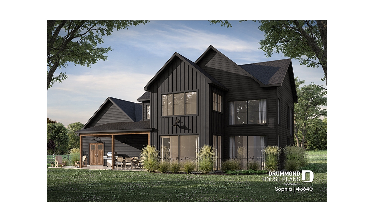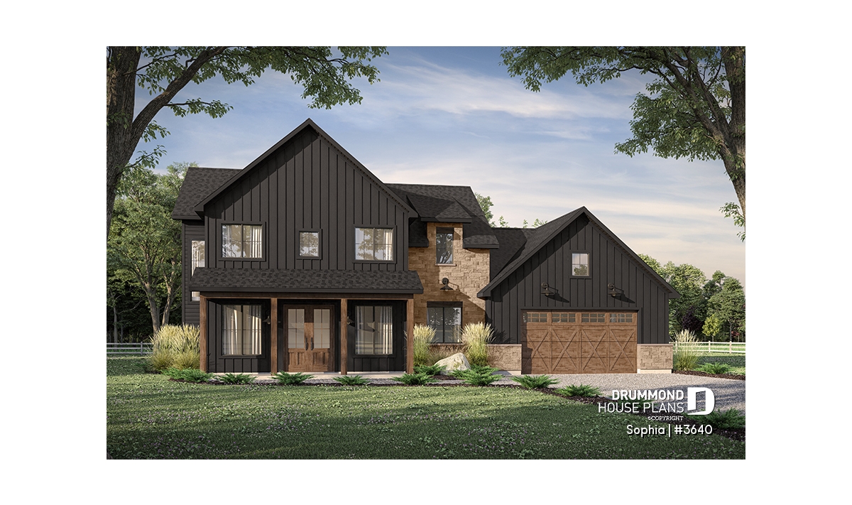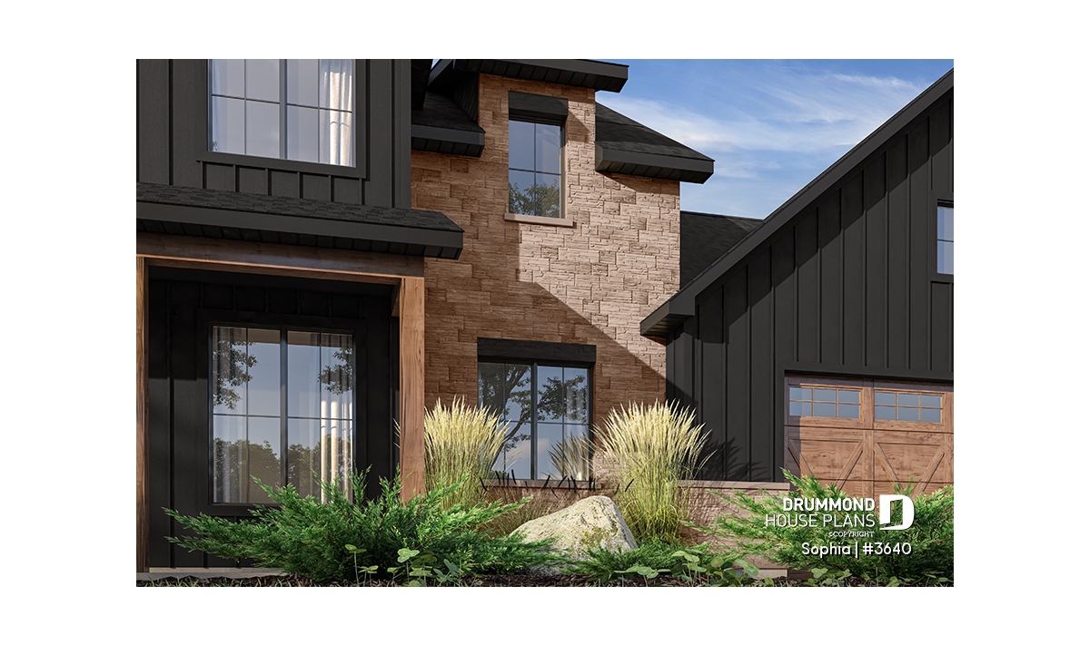 The SOPHIA home (plan #3640) offers 2,174 sq. ft. of living space, spread over two floors. The 23' x 25'8'' double garage is large enough to add a gardening area. The rear terrace offers a covered area of 22'-4 x 12'-4'' and an "uncovered" portion of 12'-2'' x 12'-4''. Several floor layouts are therefore possible. The basic foundation you will receive (included in the plan) is a floating slab. If you would like another type of foundation, simply select it in the shopping cart or contact us.