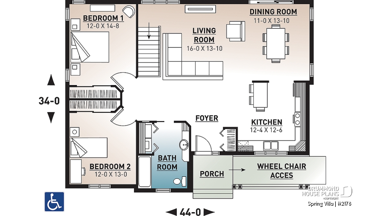 Floor plan offering easier mobility (wheel chair accessible), spacious kitchen, dining and living, 2 bedrooms