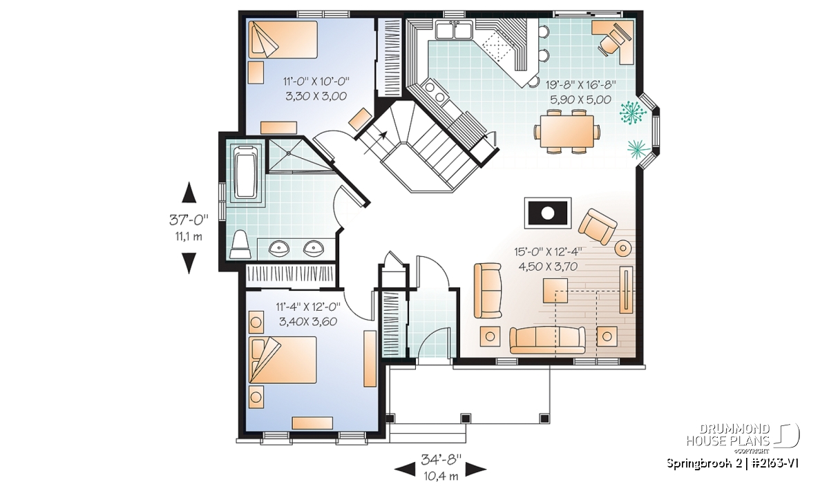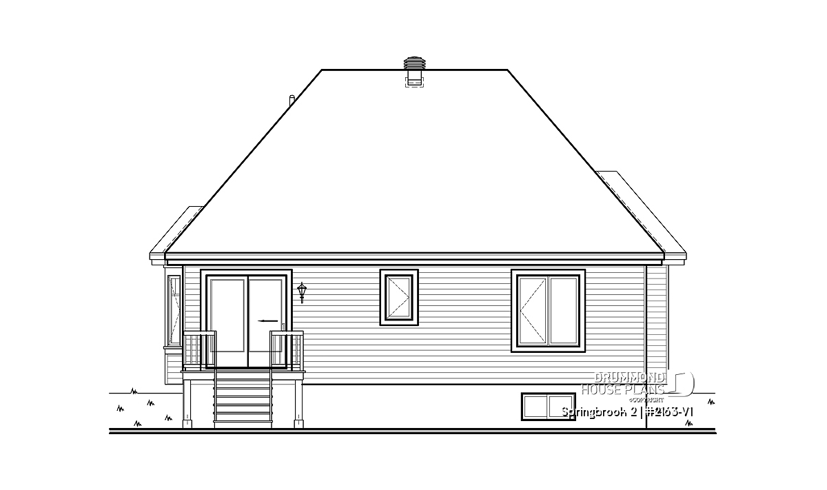 Inside, the entrance foyer is flanked by a closet along its full length and the open activities area, organized around a central fireplace, enjoys an abundance of natural light through a beautiful bay window. The angled kitchen adds a dynamic feeling to this original design.