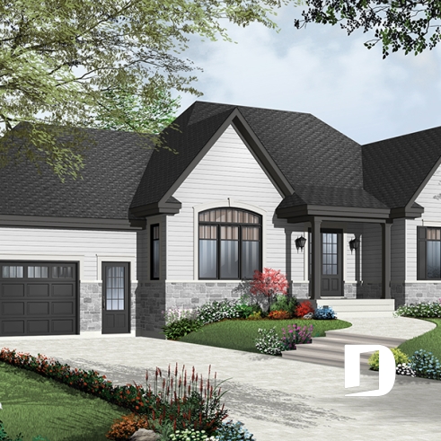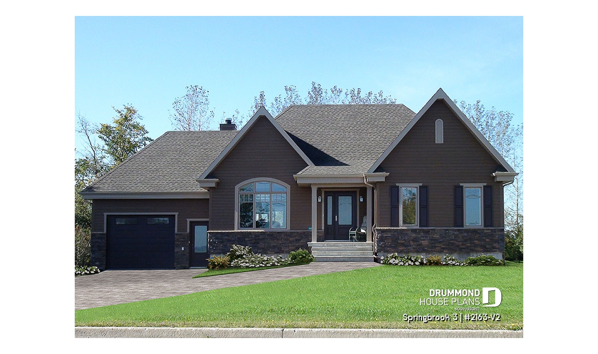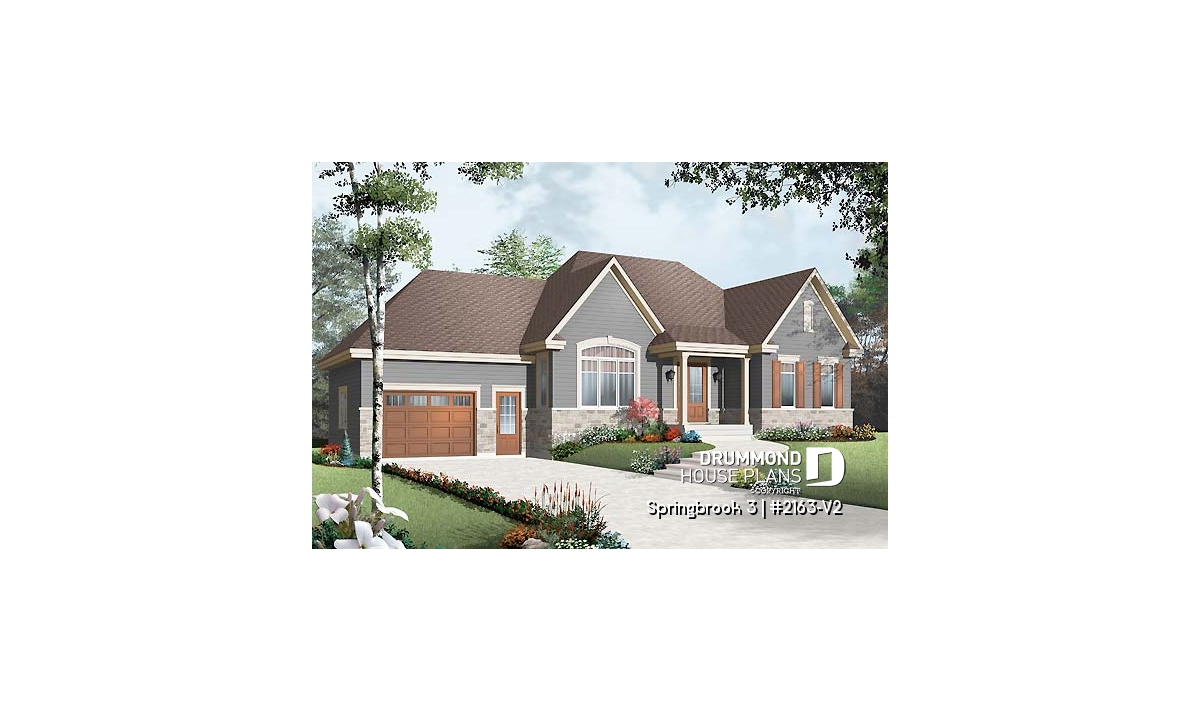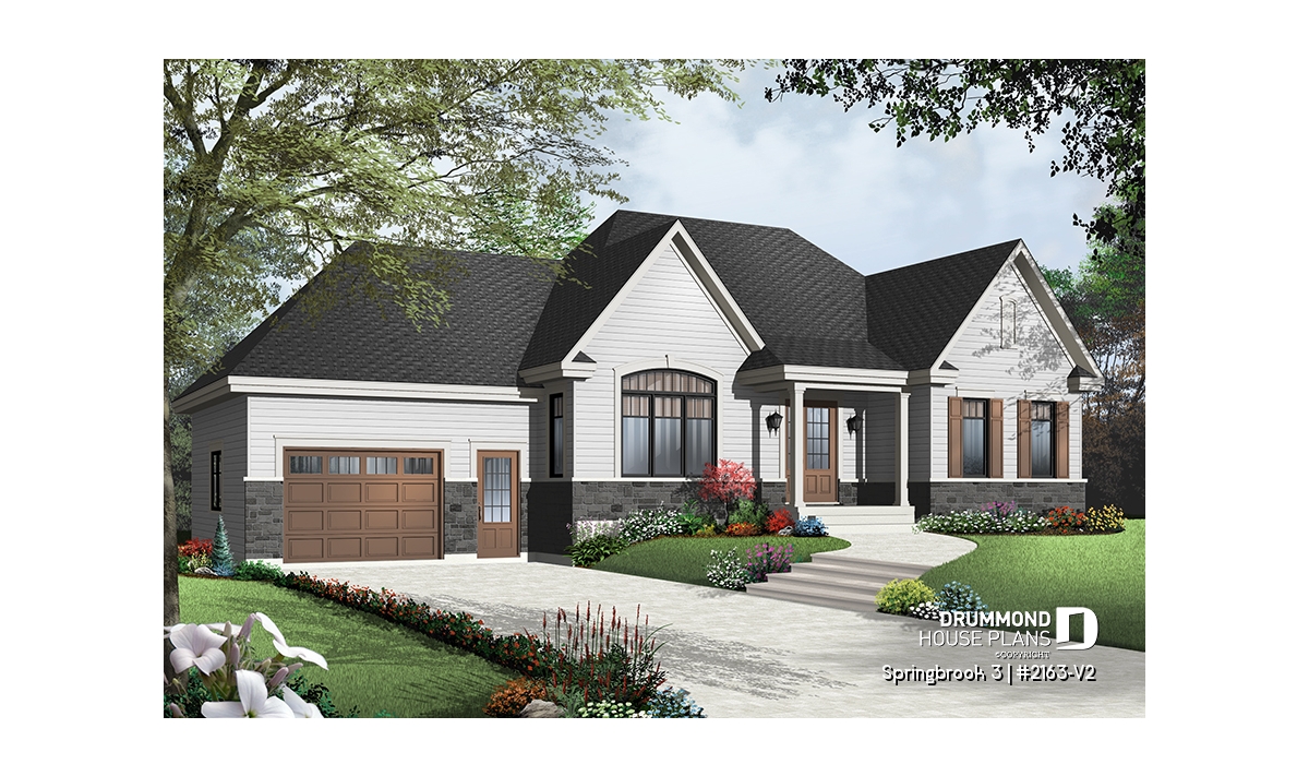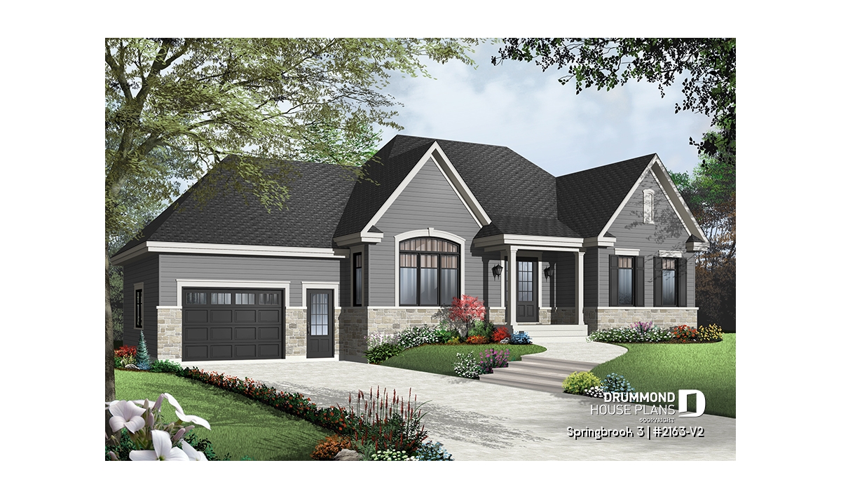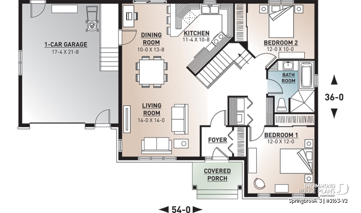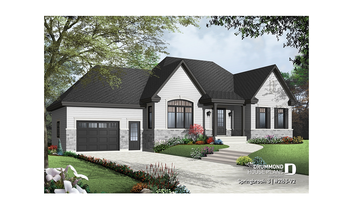 Efficient use of space allows for a feature-packed and open floor plan. The unique placement of the stairs allows for unexpected and pleasant flow to the living area. The partial cathedral ceiling in the living room further enhances the impression of generous space. This bungalow includes living room, dining room, kitchen with eating bar, computer nook, laundry area, a bathroom with soaker tub and large shower, and two bedrooms. If desired, the second bedroom could function as an office or hobby room and additional bedrooms can be added to the unfinished basement.