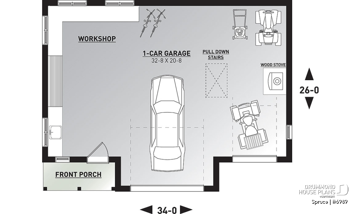 Measuring 34' x 26', the main floor provides 804 sq.ft. of usable space, ideal for parking one vehicle plus a recreational vehicle, small trailer, or seasonal equipment. The structure rests on a floating slab foundation, though other foundation types can be selected depending on your site and long-term needs.
