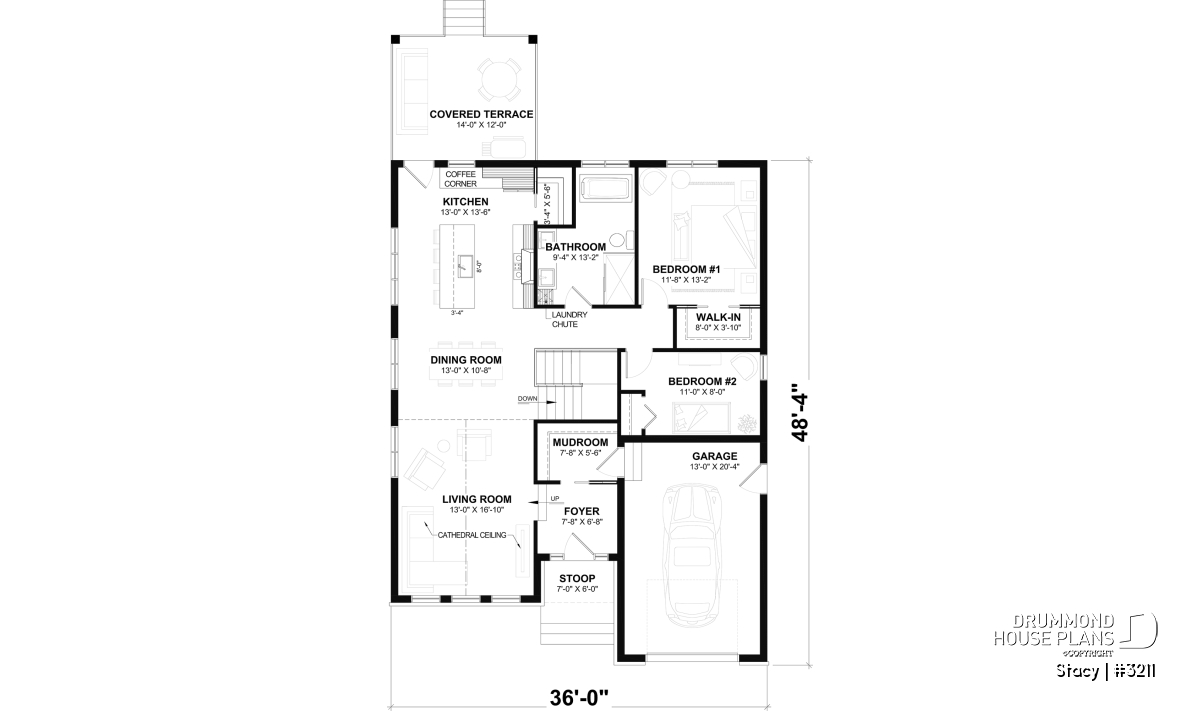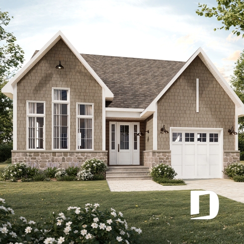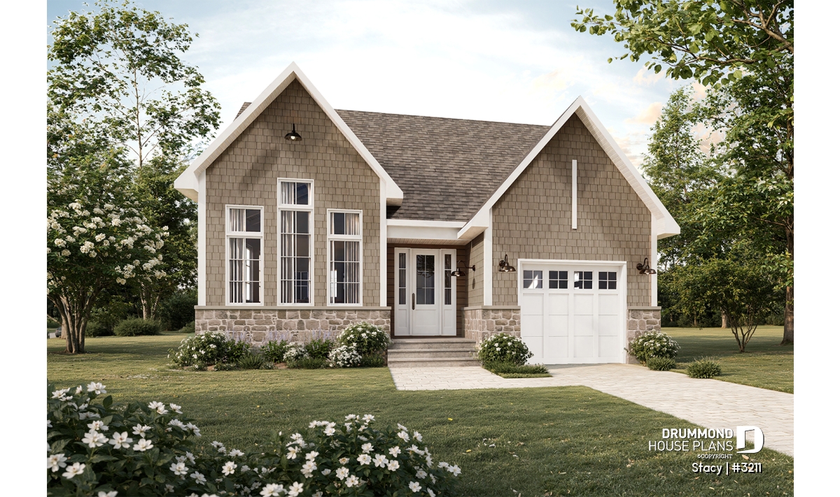 Small, comfortabe & affordable bungalow house plan, garage, for narrow lot, 2 bedrooms, open plan, 11' ceiling