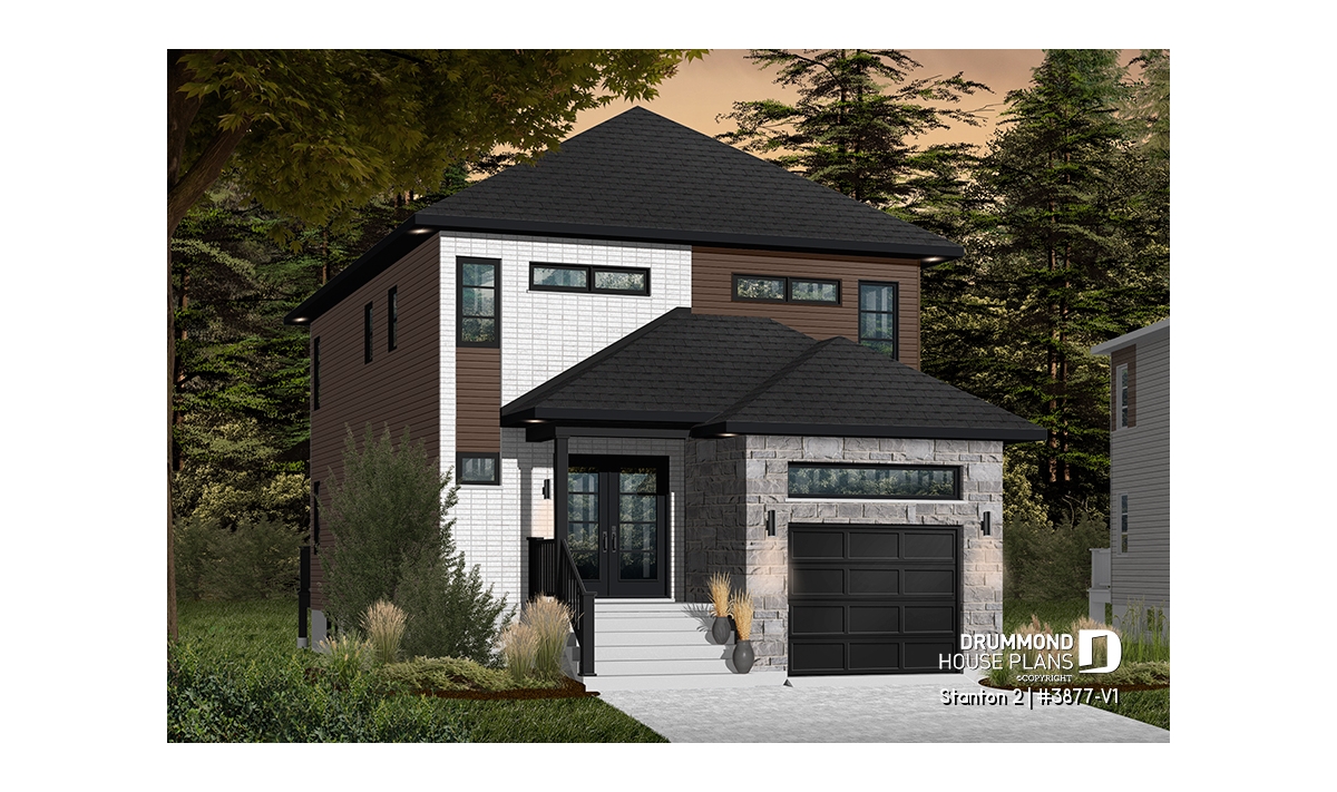 This contemporary home with integrated garage is a mere 25 feet wide and therefore ideal for narrow lots. Still there is no need to sacrifice curb appeal!