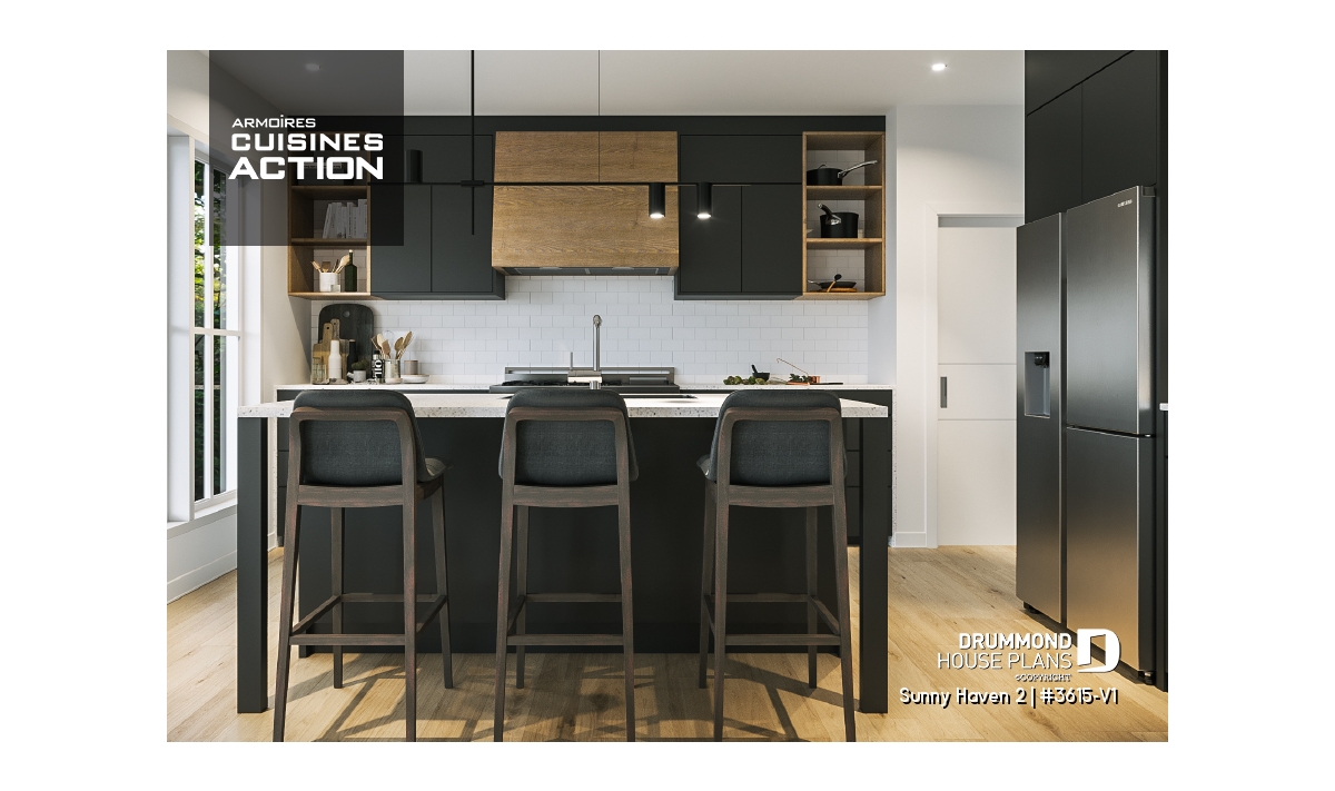 At the heart of Sunny Haven 2 (#3615-V1) lies a bright open-concept living area that brings together the kitchen, dining space, and living room. Designed for connection and flow, this central area benefits from generous windows and a seamless relationship with the outdoor surroundings. The kitchen features a large central island and a walk-in pantry, offering both efficiency and comfort for everyday use. The living room is enhanced by a fireplace, creating a cozy atmosphere ideal for family gatherings and relaxed evenings.
