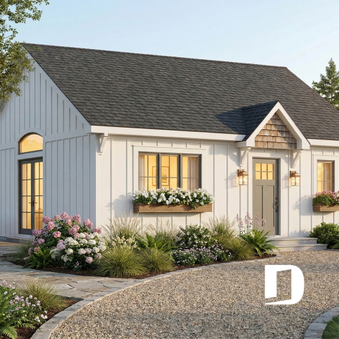 The The Bounting (#2180) model is a thoughtfully designed small single-story house plan created to deliver maximum comfort in a compact and cost-effective layout. With its 784 sq. ft., it is perfectly suited for first-time buyers, cottage projects, or anyone looking to build a warm and inviting home while maintaining a well-controlled budget. Its farmhouse style, both simple and timeless, blends easily into various settings, whether in urban areas, the countryside, or natural surroundings.