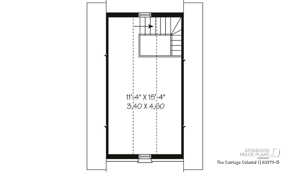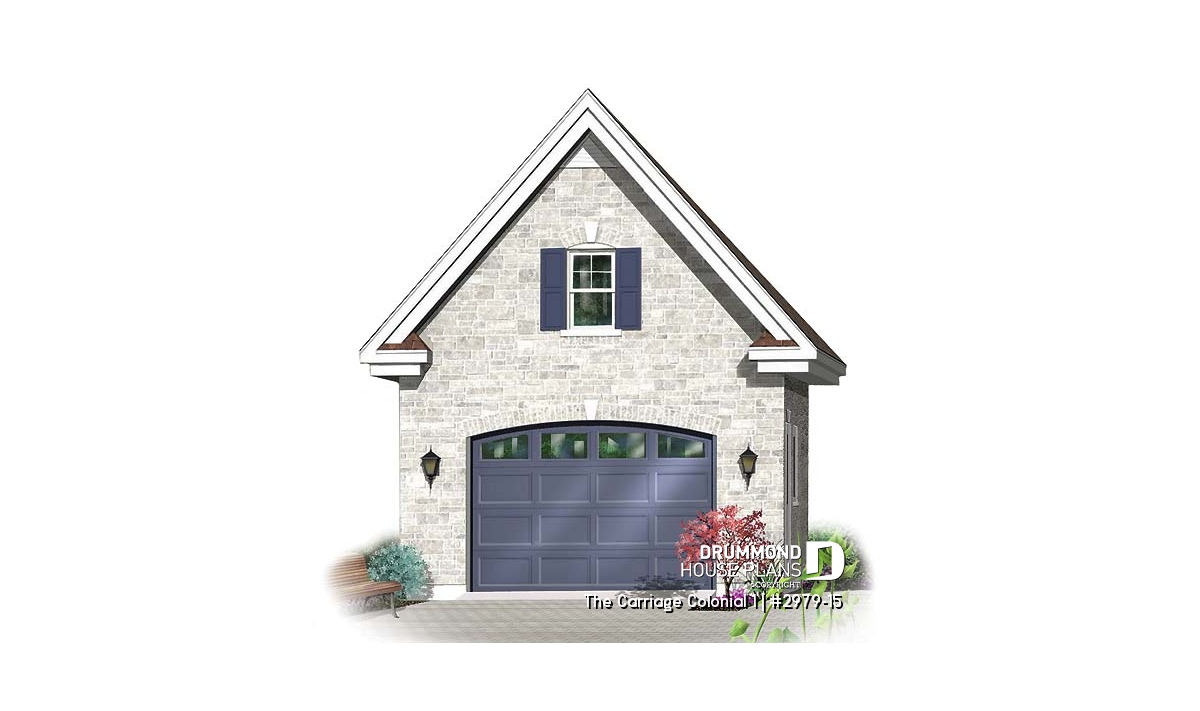 Store your ride in style in this charming colonial style garage. Stonework, decorative trim, an arched door and a shuttered window create a most pleasing facade. Stairs lead to a 231 square foot storage area which would also delight youngsters as a play area.