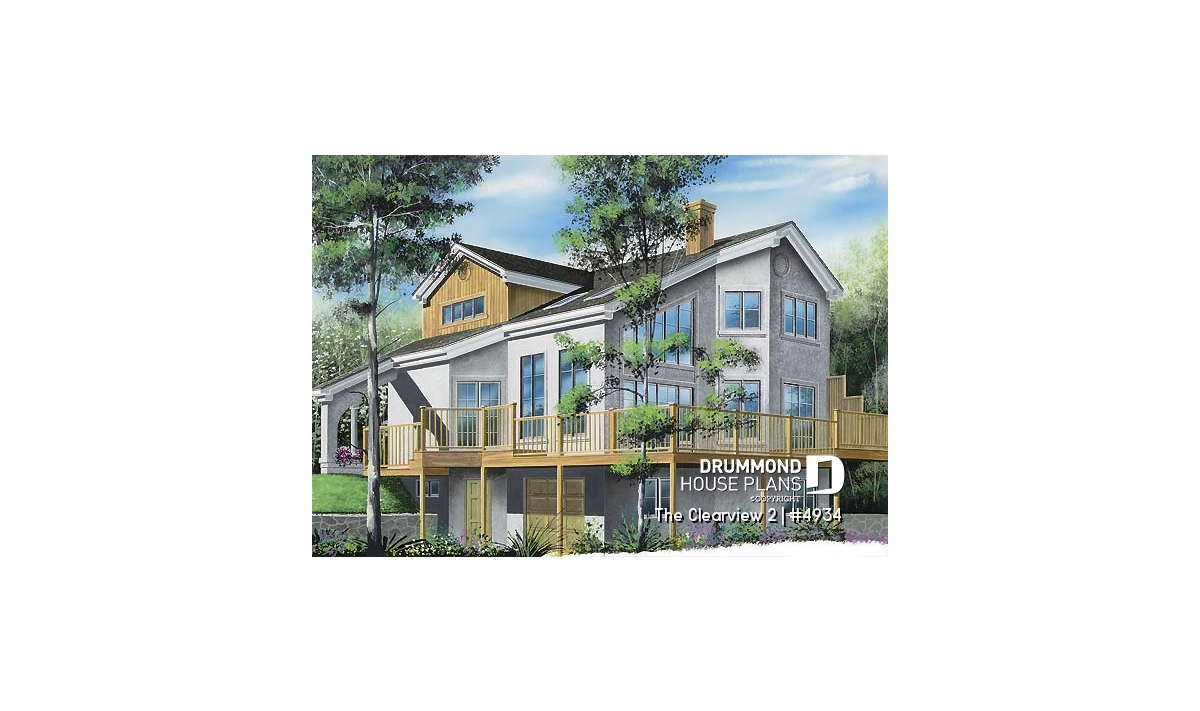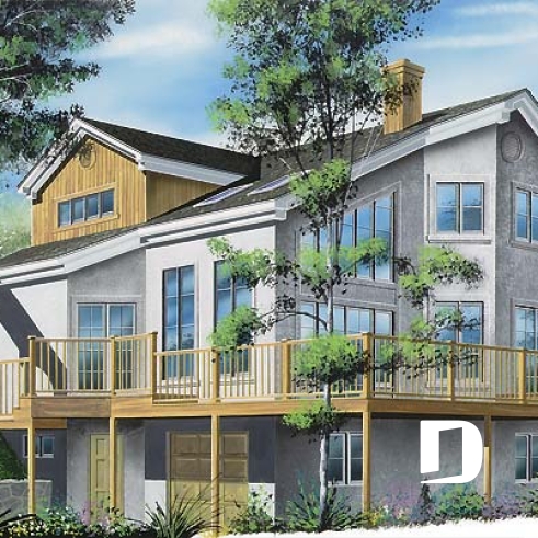 Family and guests will enjoy great views from every room in this contemporary vacation house through a multitude of full-length windows. A fireplace and soaring ceiling enhance the light-filled sunken living room. The adjacent dining room and open kitchen further enhance the open living area. Step onto the spacious wraparound deck from either the kitchen or dining room. A master bedroom is conveniently on the main floor and enjoys a walk-in closet and private bathroom access.