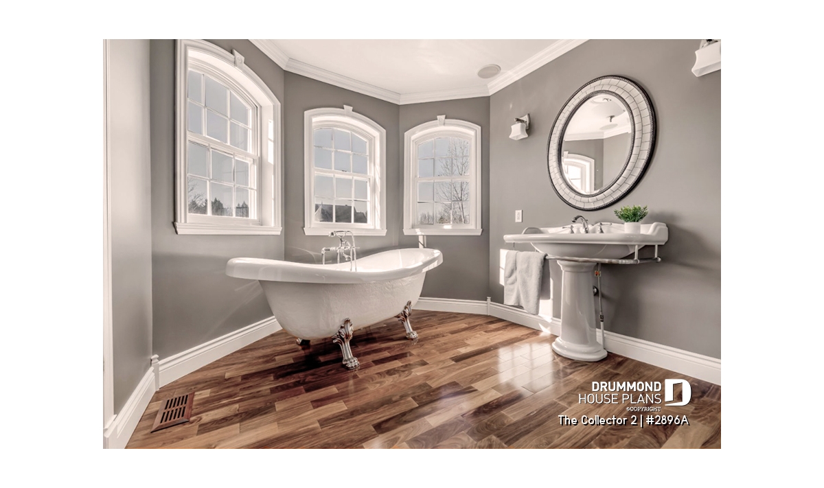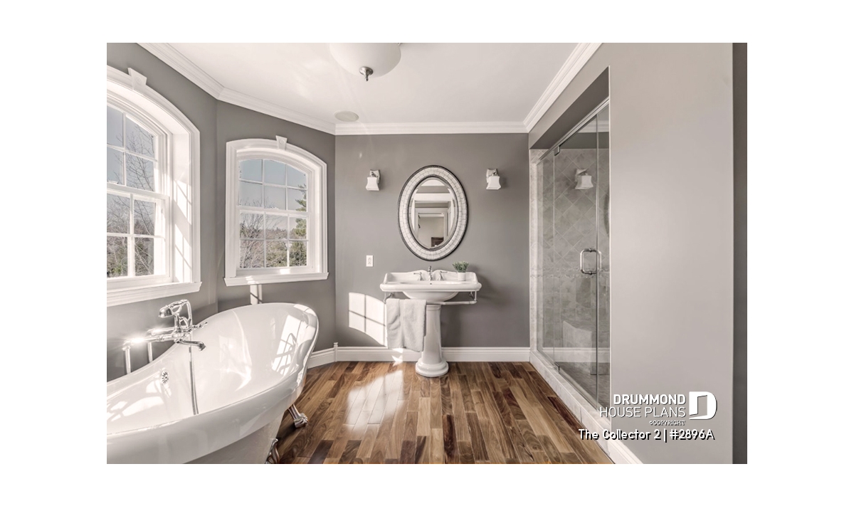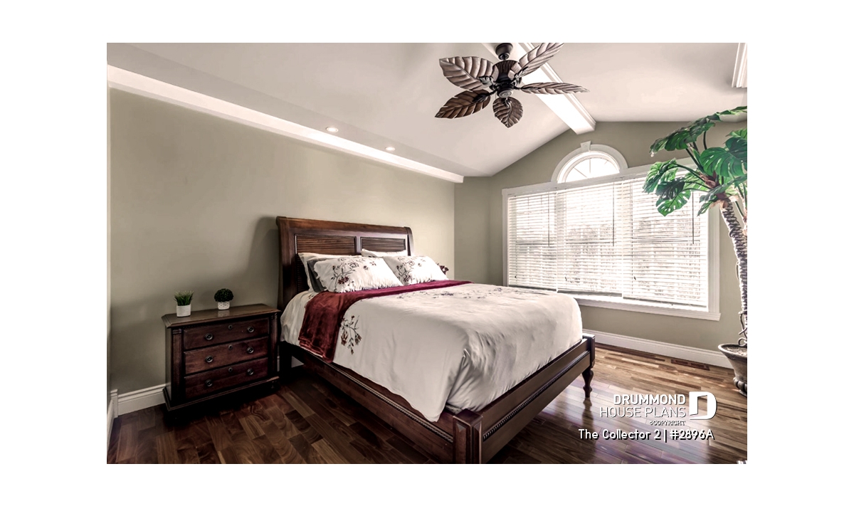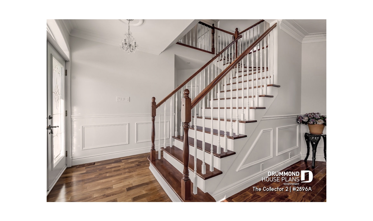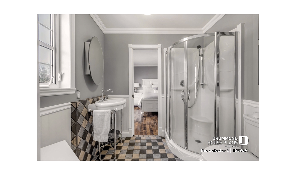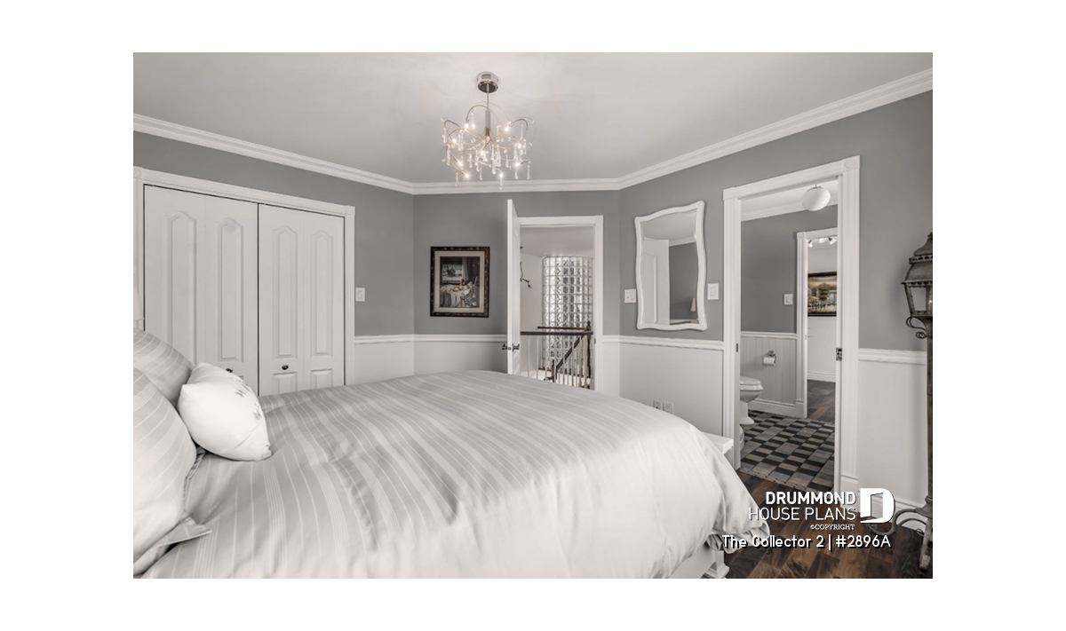 Upstairs, the primary suite provides a serene retreat with its private ensuite bathroom and spacious walk-in closet. Two additional bedrooms share a full bathroom with both tub and shower, while a convenient second-floor laundry room adds modern practicality. **A version of this house plan, offering the master bedroom on the main floor, is available, see plan #2898.