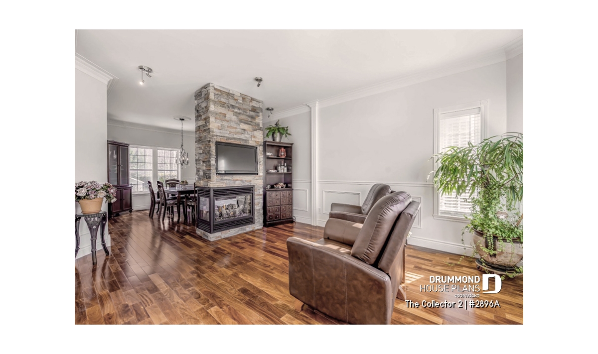 Double-sided fireplace between the living and dining rooms.