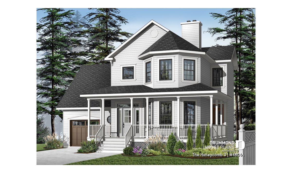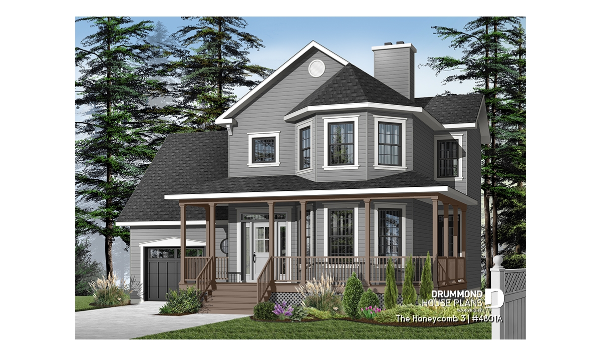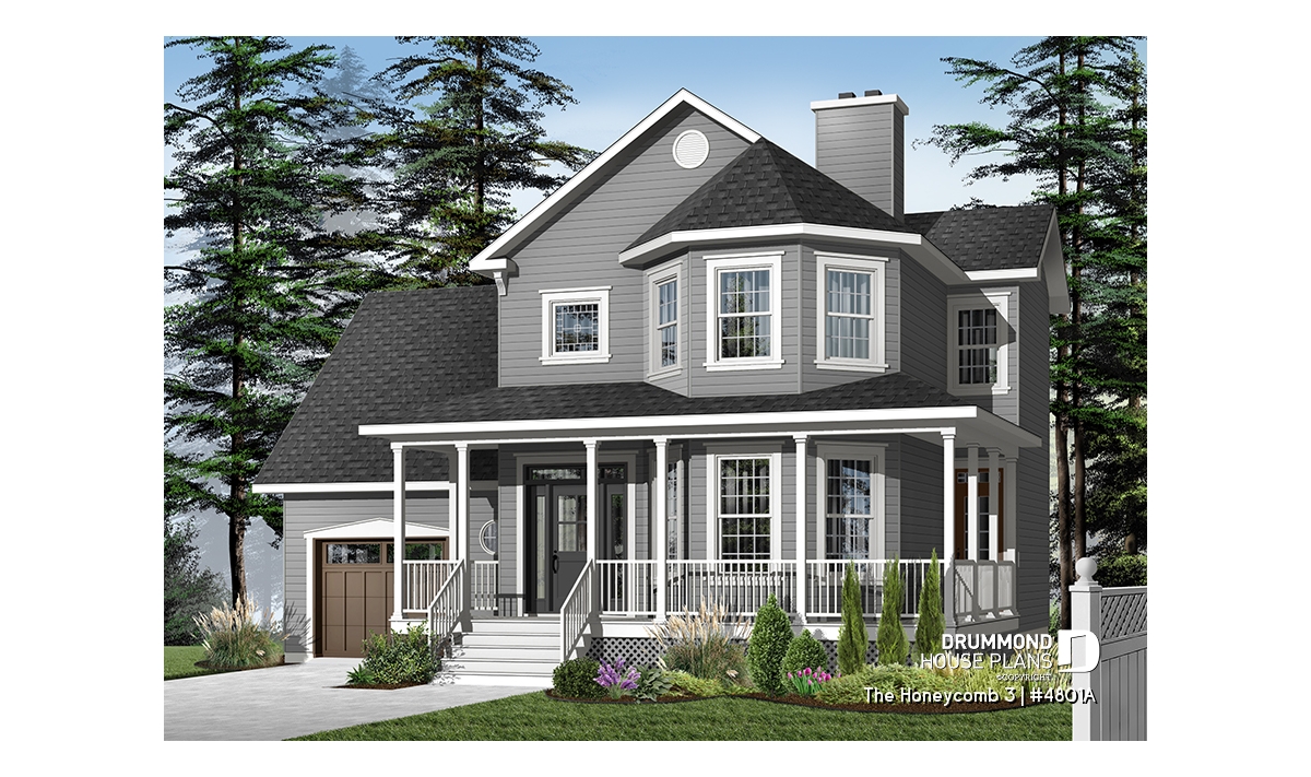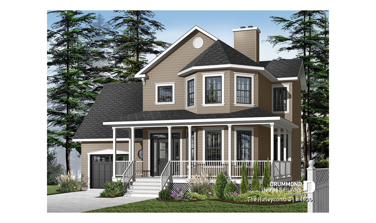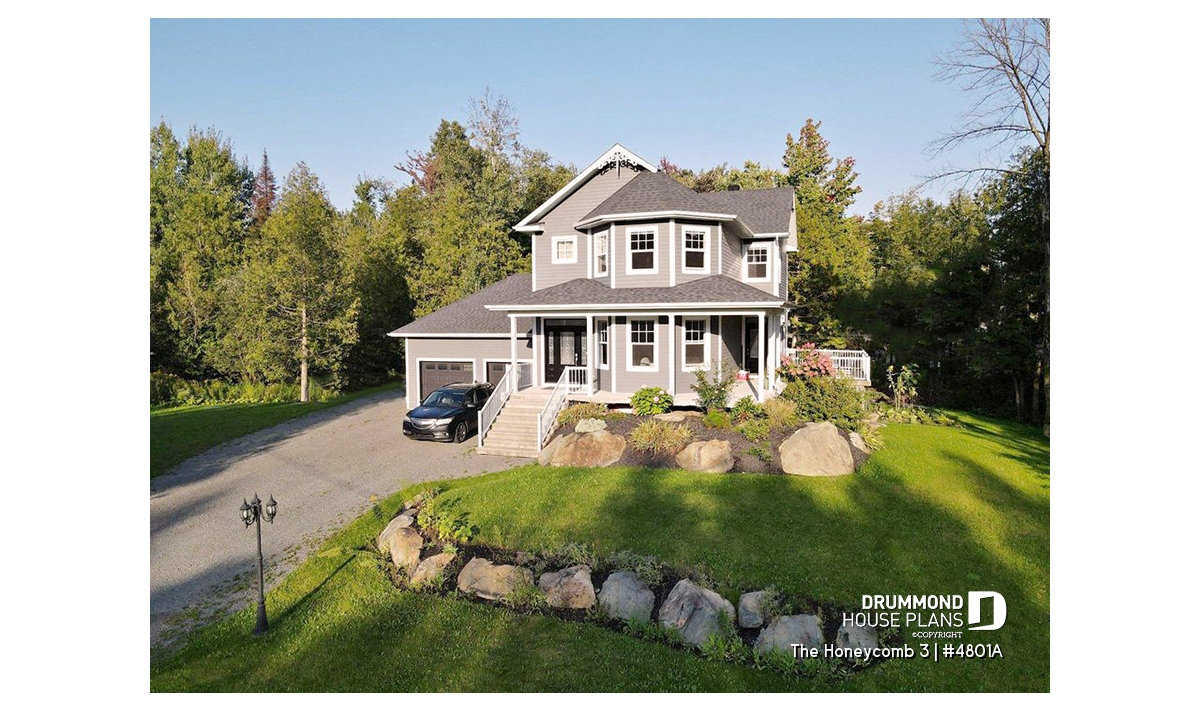 Here, nothing escapes the designer’s eye. A large gallery, linking the front and left façades, assures a covered access to the main entrance as well as to a second entry which opens into the dining room; an impressive turret projects out from the main façade and procures both charm and natural light to both the living room and master suite. A good sized lowered garage, which is often requested in new residential areas, proposes a very attractive bonus space above, which many homeowners will appreciate decorating as they fancy.