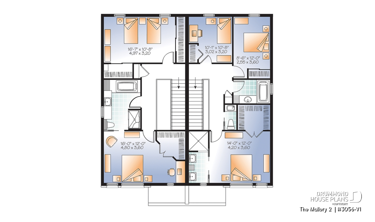 Upstairs, one unit includes a walk-in closet and semi-private bathroom access. A large second bedroom could easily be divided at the time of building or later on. The second unit master suite includes a walk-in closet, shower and dual vanity. A separate toilet room and bathing room provide privacy for family members. Additional living space or storage is available by developing the full basement.