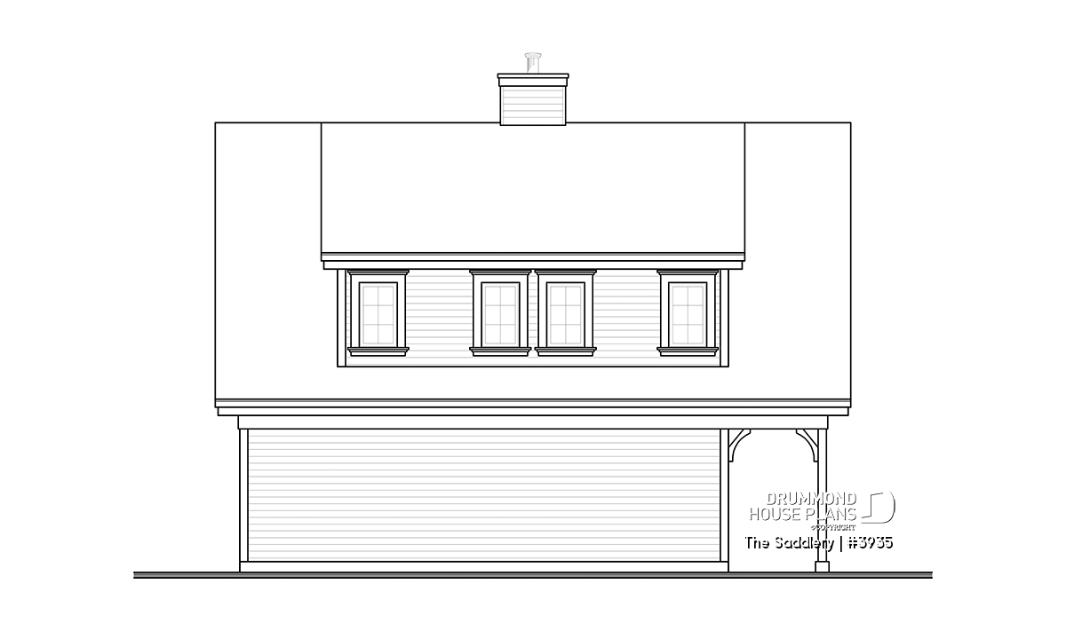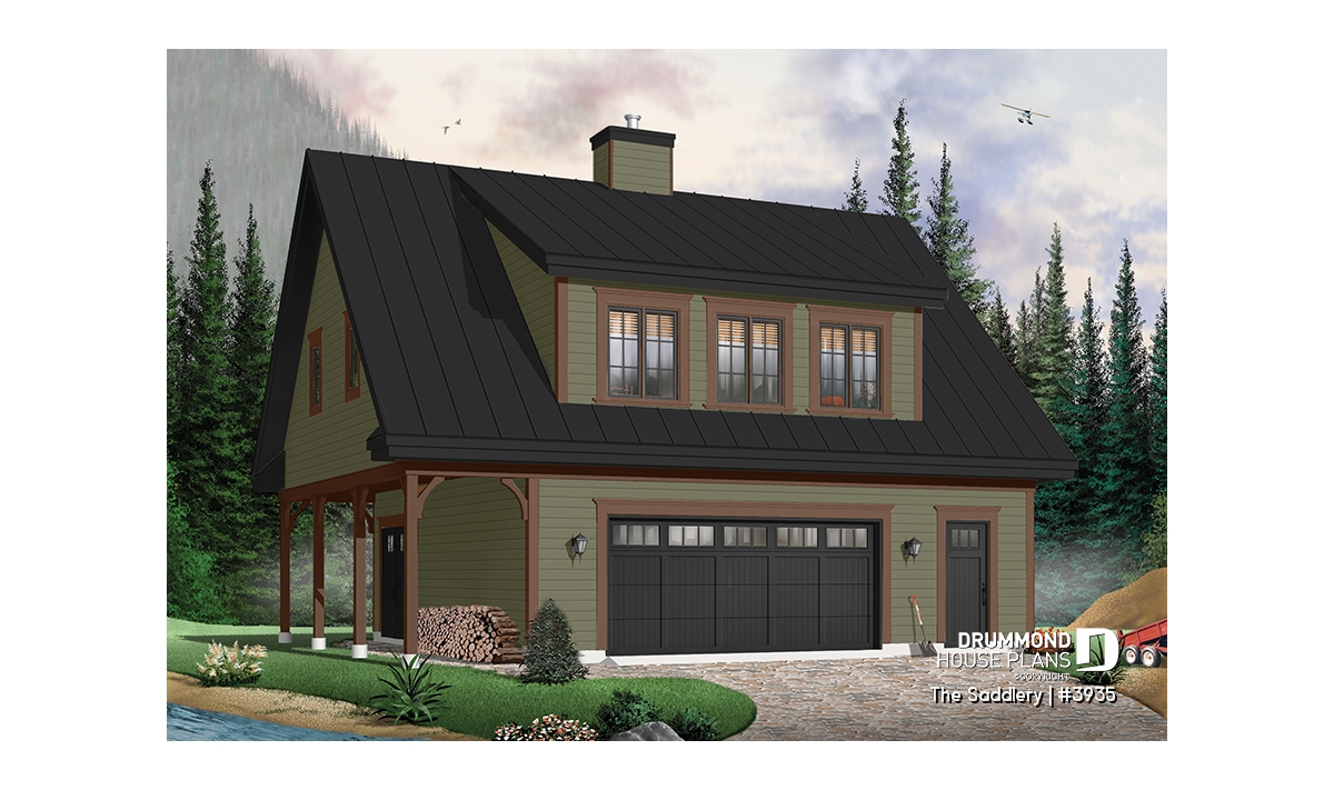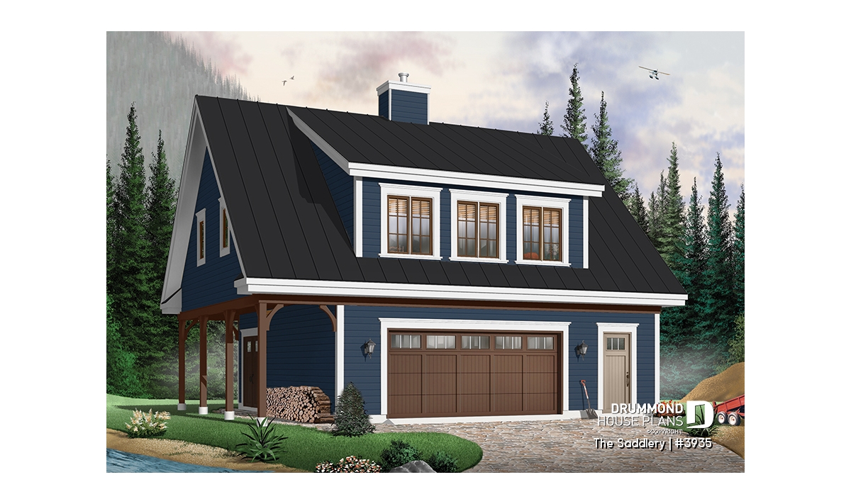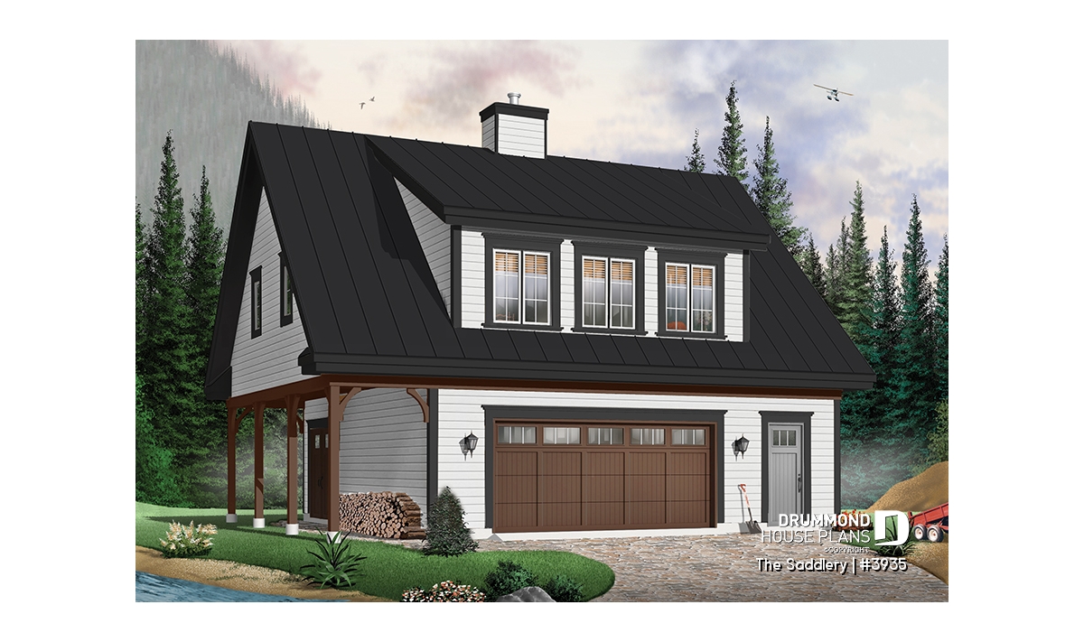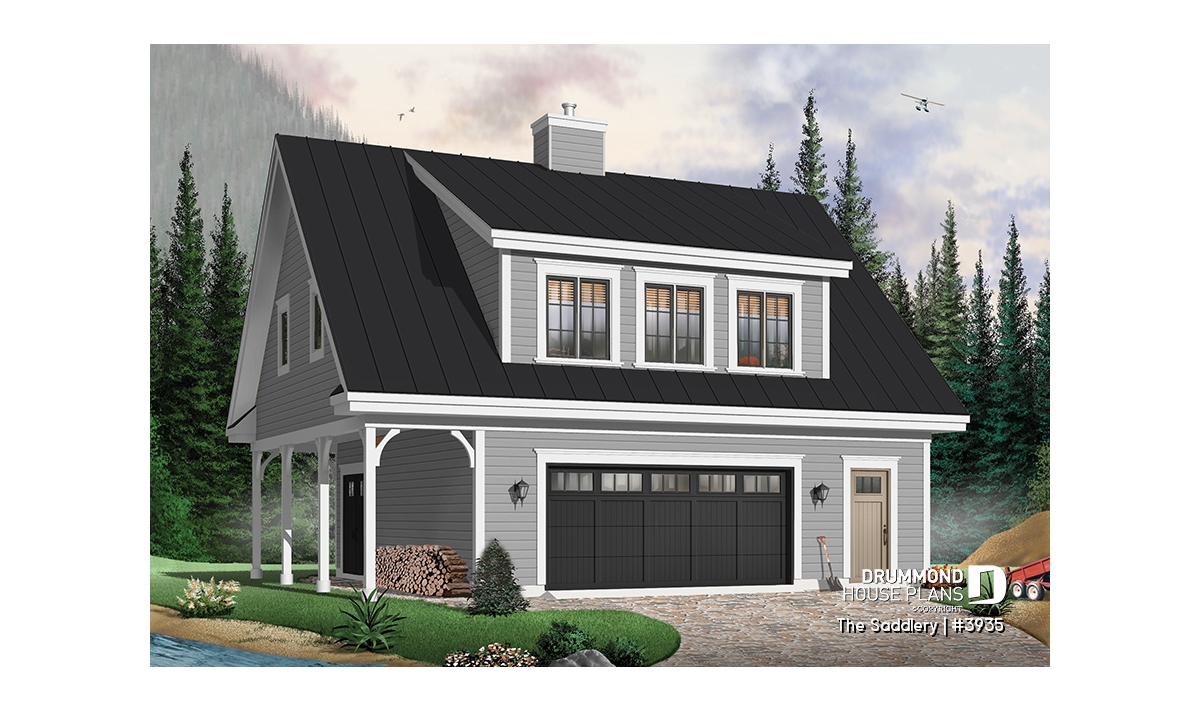 The oversized shed dormer and trio of windows ensure ample light for the suite upstairs. A covered shelter provides enough space to store a few cords of wood safe from the elements and for easy access via the garage.