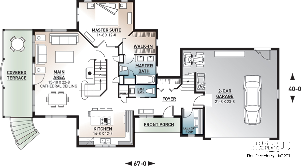 The addition of the double garage bulk to original plan 2939 (which can be viewed on the internet site drummonddesigns.com) thereby adds square footage for the addition of a comfortable entrance foyer, an independent laundry area, a master bedroom suite with private bathroom and large closet, a more than enviable living room/dining room and a kitchen with central island and remarquable lunch counter.