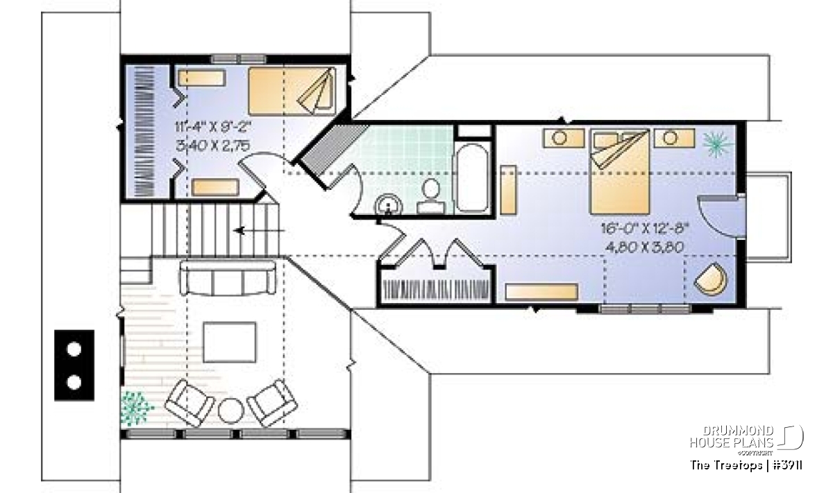 On the upper level, two bedrooms, one of which is a rather comfortable master bedroom, share a bathroom and a small corner of the mezzanine which opens to the living room below.