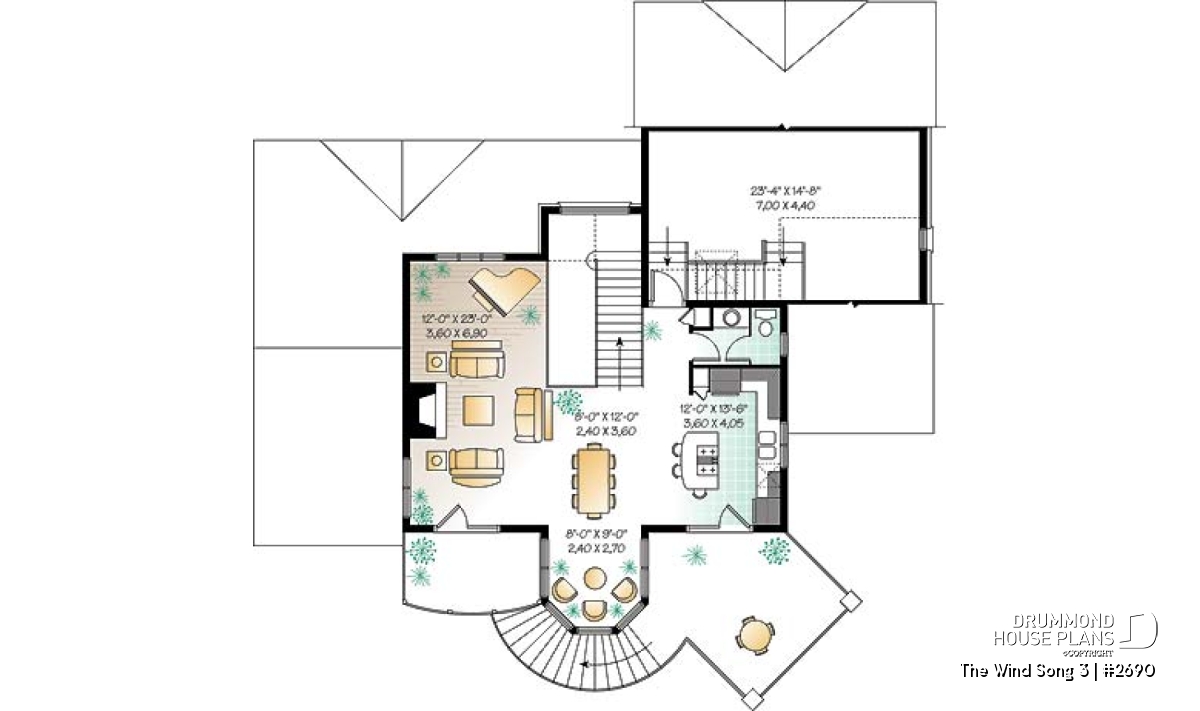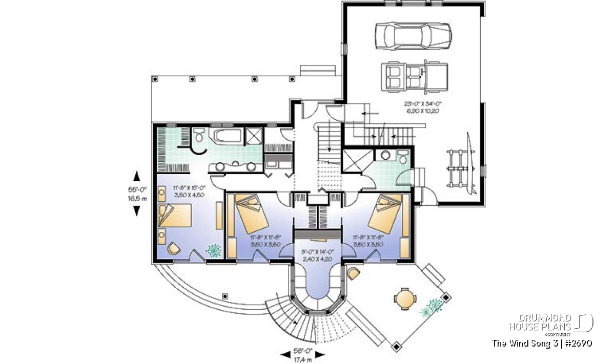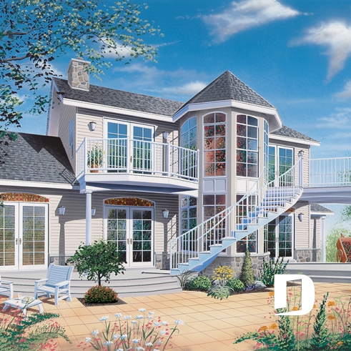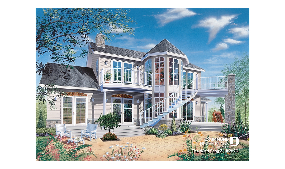 Bathing in natural light, this 2068 sq.ft. three bedrooms with 2.5 baths features a main-level master suite and bath, two secondary bedrooms, and bath. For a creative twist, the second-level hosts the living room, fireplace, dining room, lovely solarium for extra seating, counter kitchen, breakfast area, and half-bath. A cuvacious exterior stairway sets off the look, dramatically.