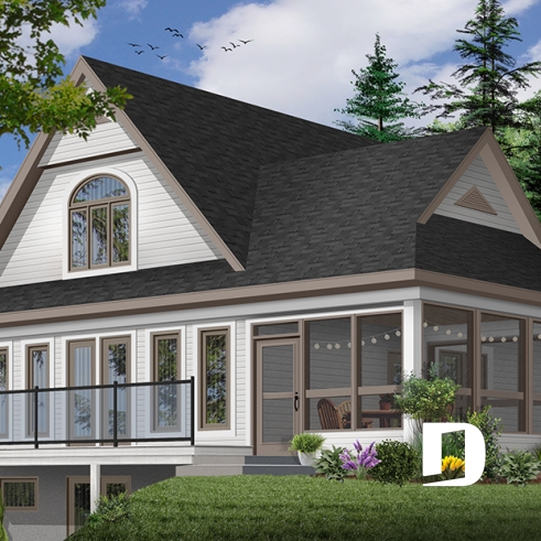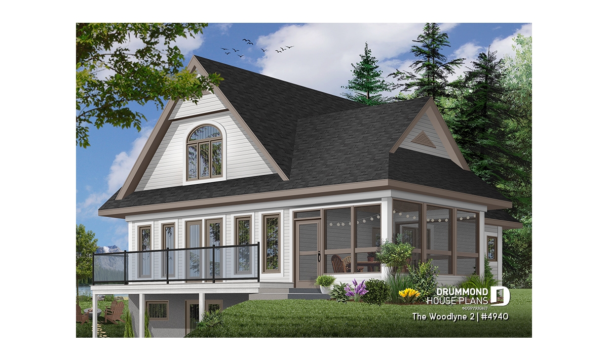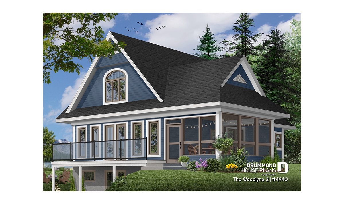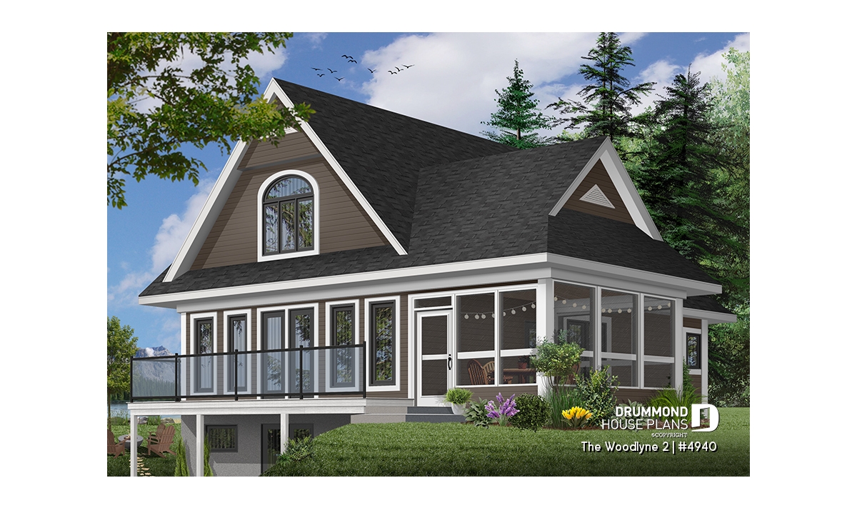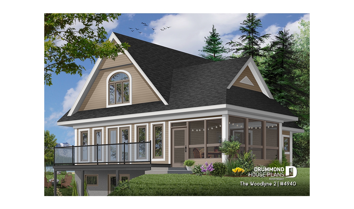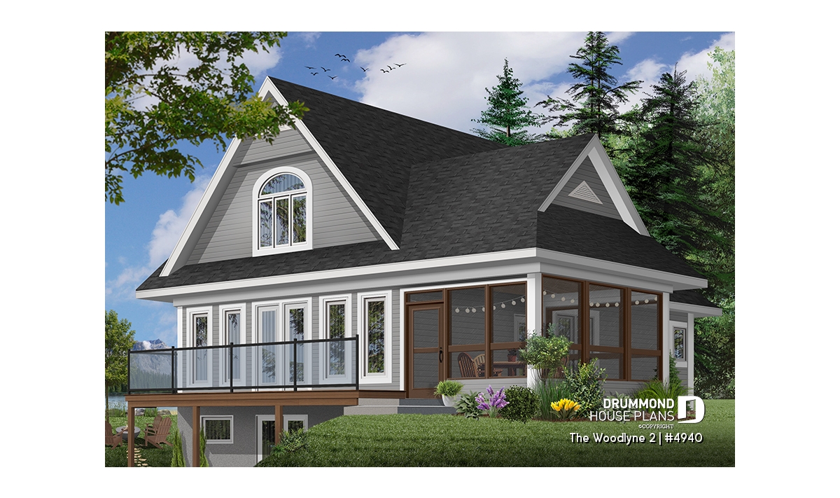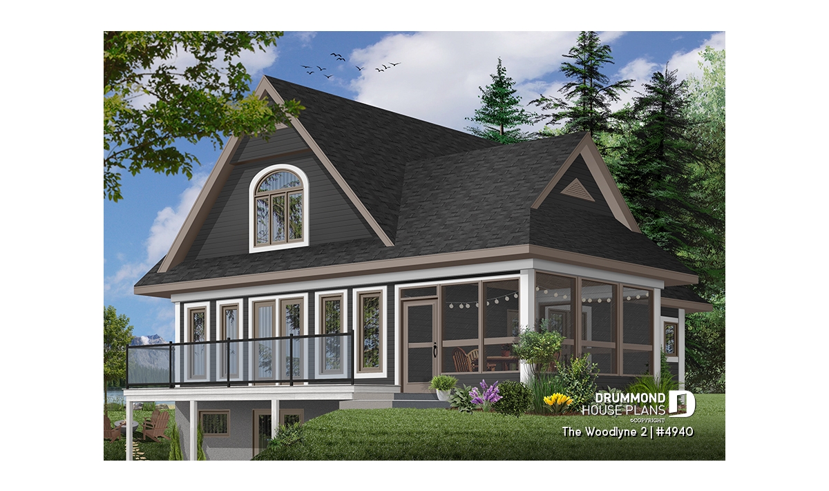 At the origin of many vacation home models proposing an interior layout with truly panoramic views and which you can view on http://www.drummonddesigns.com/, this one is even more interesting by the fact that it suggests a sheltered screened-in terrace in order to enjoy meals outside, safe from mosquitoes.