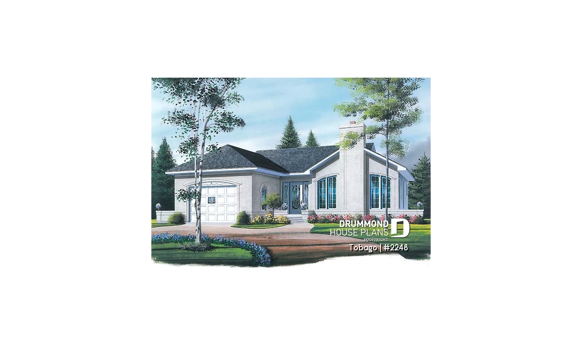 1st level - American style one storey home plan with 2 bedrooms, large kitchen, fireplace in living room & one-car garage - Tobago